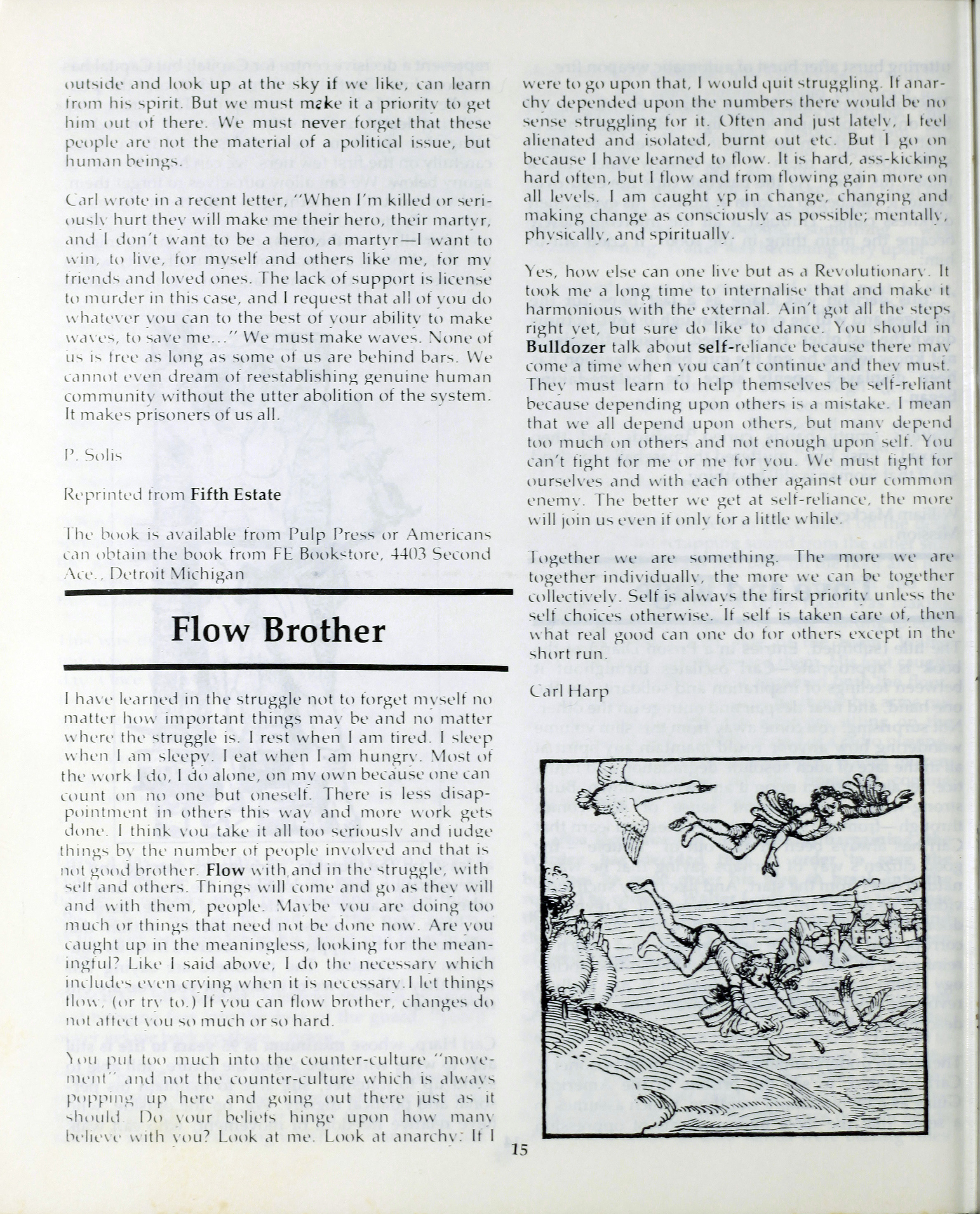 An anarchist publication from Toronto made to support prisoners in various penal institutions. It began in 1980 and featured articles, letters, art, poetry etc. by prisoners and ex-prisoners. By Spring 1997 it had incorporated another journal called the Prison News Service and began to focus more on justice-related issues in Canada, namely: prisons, local jails, refugee detention centres, and First Nations self-determination. In this issue: "Introduction"; "Yesterday"; Imbedded; As one" [poems] by Freddy Jo Morry; "Down in Australia"; "Financial wizards"; "Prison incentive"; "Pontiac victory"; "Through resistance - Victory"; "Concerning Utopia"; "No slots for friends"; "The tunnel and the light" [poem] by Roy Trace; "Baseball caps...skin frisks...and razor blades" by William Mackey; "Love and rage"; "Flow brother"; "Rebellion without resistance"; "Prison rules"; "A message from the earth"; "Statement to the people"; "Song of truth" [poem]; "Tribute to Bobby Sands"; "British harvest"; "Arkansas Suffle"; "Poor us"; "Chimurenga"; "Redneck brigade" [poem] by Tim England; "Red Army hunger strike"