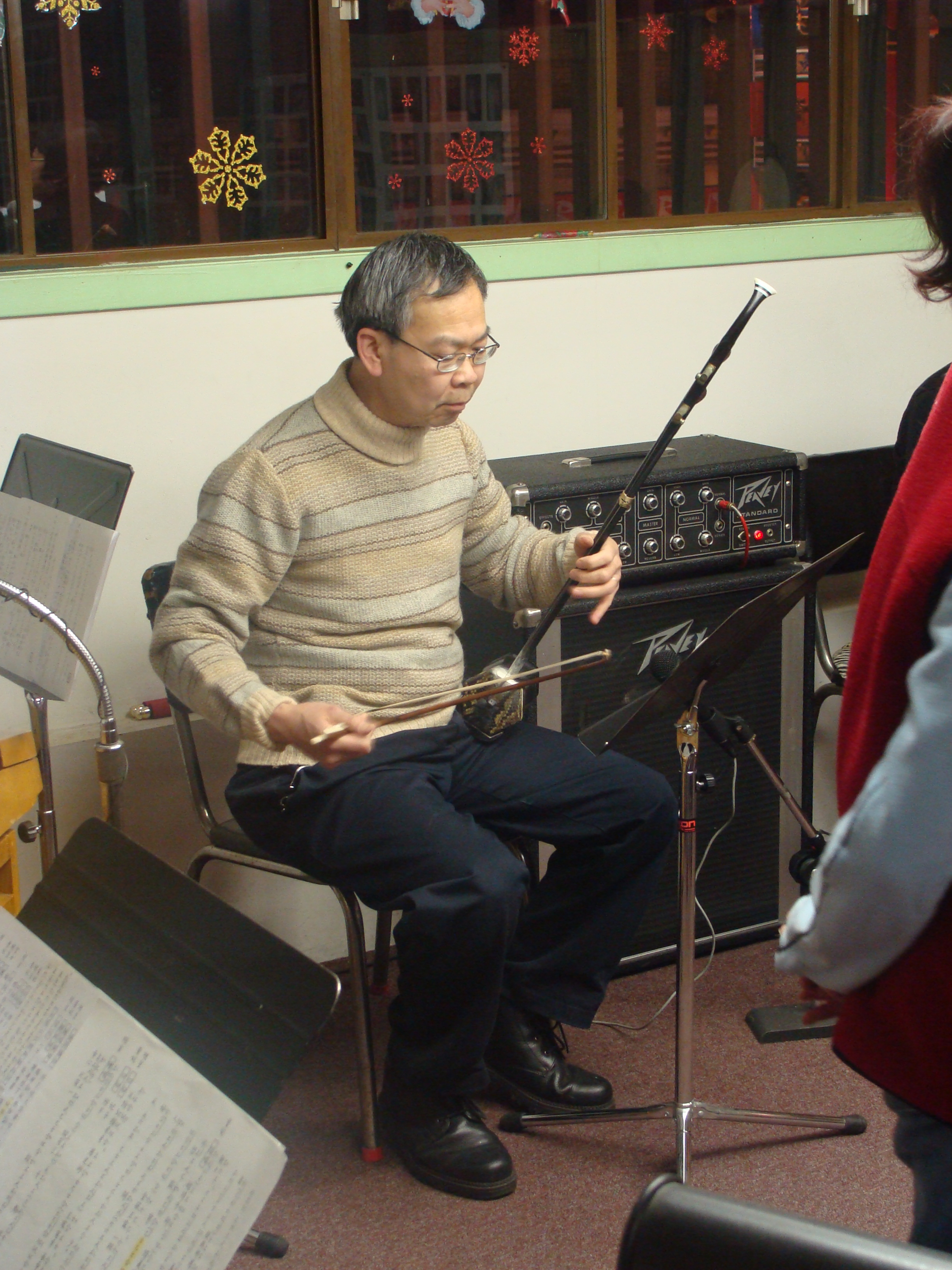 Shows a musician playing Erhu in the meeting room of the Gum Sing Musical Society. The Erhu (二胡) is a two-stringed bowed musical instrument which is known in the Western world as the "Chinese violin" or a "Chinese two-stringed fiddle". It is the most popular instrument in the Huqin family used by various ethnic groups in China.