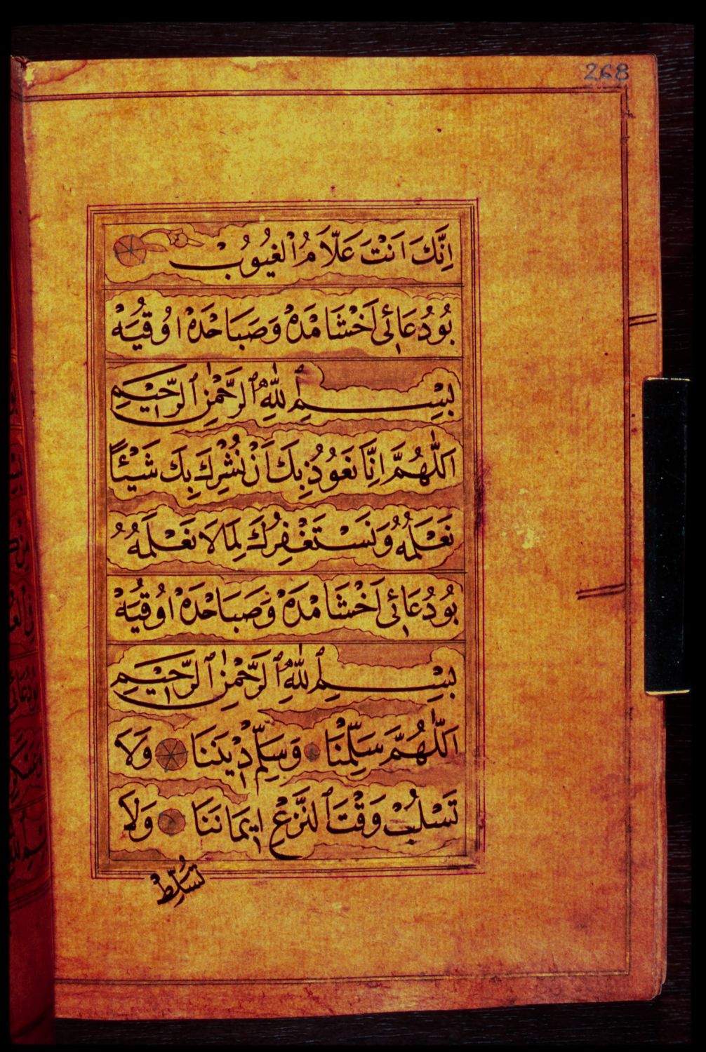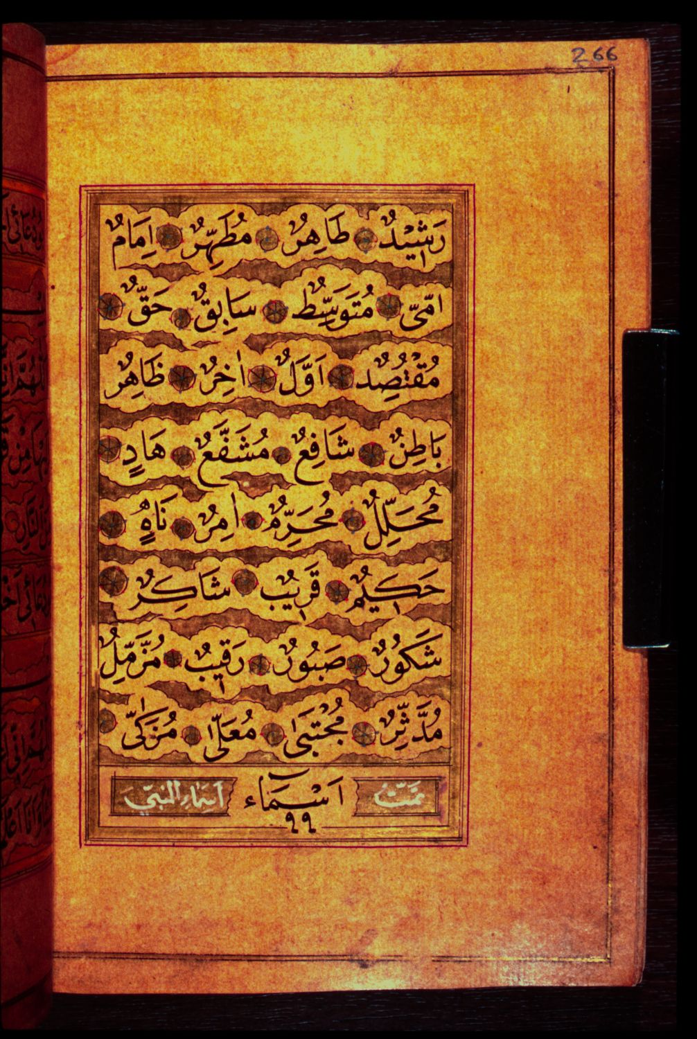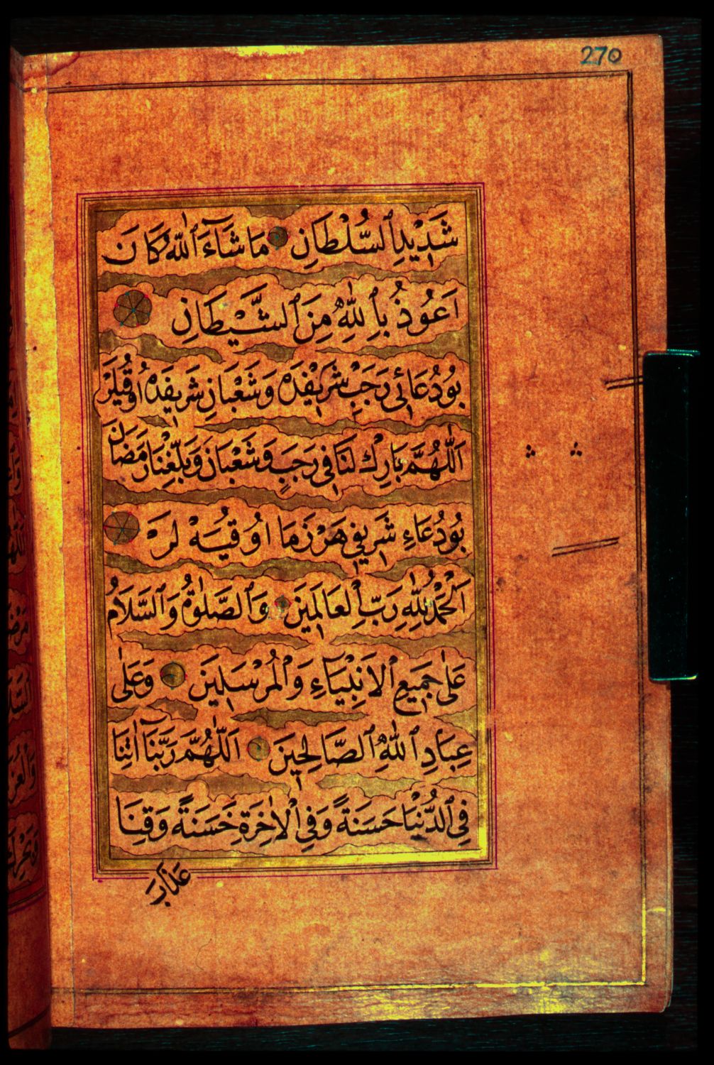 An’ām-i Sharīf, an Ottoman prayer book of the late 18th century, showing Sūrat al-Fātiḥa. Collective volume with texts in Arabic and Turkish, manuscript on brownish coloured European paper (with watermark, not further analyzed) of two different types (pp. 1-312, 313-412), written mostly in a bold, fully vocalized naskh script. Two (or possibly even three) hands can be distinguished: pp. 4-271, 272-310, 313-403, the first of which is of calligraphic quality, the others are less accomplished, and on p. 311 the colophon is written in thuluth script by the first or second copyist. The divide between the two sorts of paper coincides with the divide between hands. At the end of the volume (pp. 406-408) a Turkish text has been added, which is written in ruqʿa script within frames that were not used for the second part of the volume. The entire content of the volume is set within a composite frame (gold, red), black ink, with the use of gold and white ink, and several colours. Up till p. 311 the texts are written in 9 lines to the page (traces of the use of a misṭara), with cloud shaped divisions between the lines. From p. 313 onwards many calligraphic panels and drawings are given with a varied number of lines. The first part of the manuscript is dated 1201 (1786-1787), and was allegedly copied by Mūsā Efendi b. Ḥasan Efendi, a pupil of Ibrāhīm al-Rudūsī Efendi, but actually it was copied by Musṭạfā Ayyūb Efendīzāda (colophon on p. 311, see transcript and translation below). This first part has catchwords at the bottom of every verso page. Larger illuminations are on pp. 4 and 272, and in the text part there numerous smaller headings in white ink on a gold background. There are numerous illustrations in the second part (pp. 313-403). The volume is bound in a full-leather Islamic binding, with gilded ornamentation (borders, central medallion, corner pieces). Remnants of painted gold ornamentation on the edges (floral motifs) are still visible. Taken from "The Islamic Manuscripts in the McPherson Library, University of Victoria, Victoria B.C." by Jan Just Witkam (Professor of Paleography and Codicology of the Islamic World, Faculty of Humanities, Leiden University, Leiden, The Netherlands, 2010), Journal of Islamic Manuscripts 1 (2010), pp 101-142.