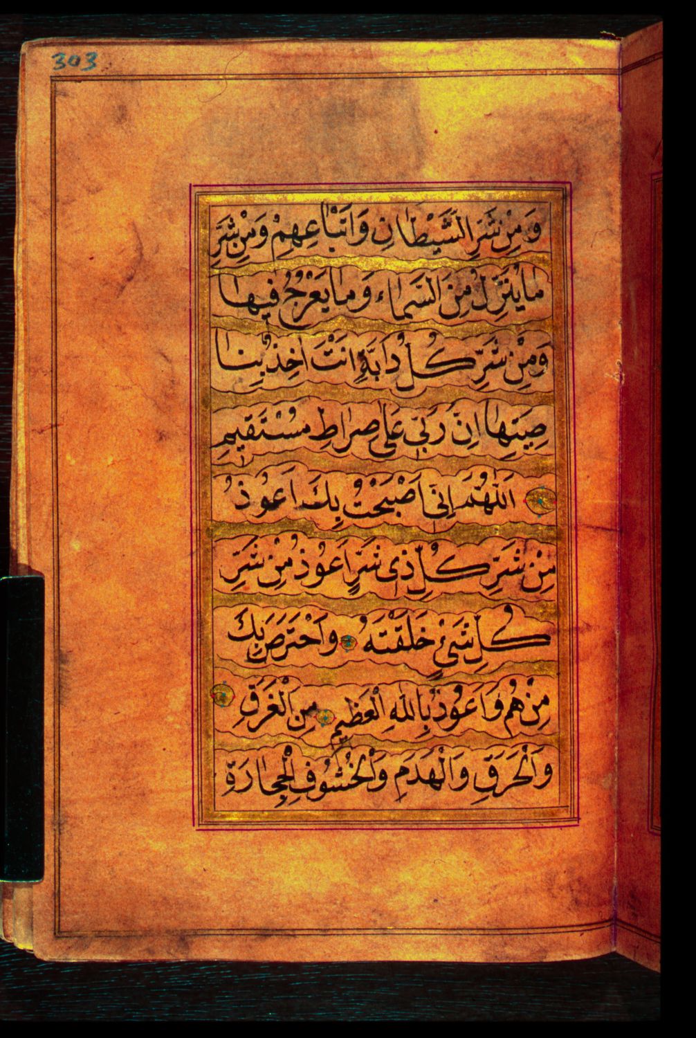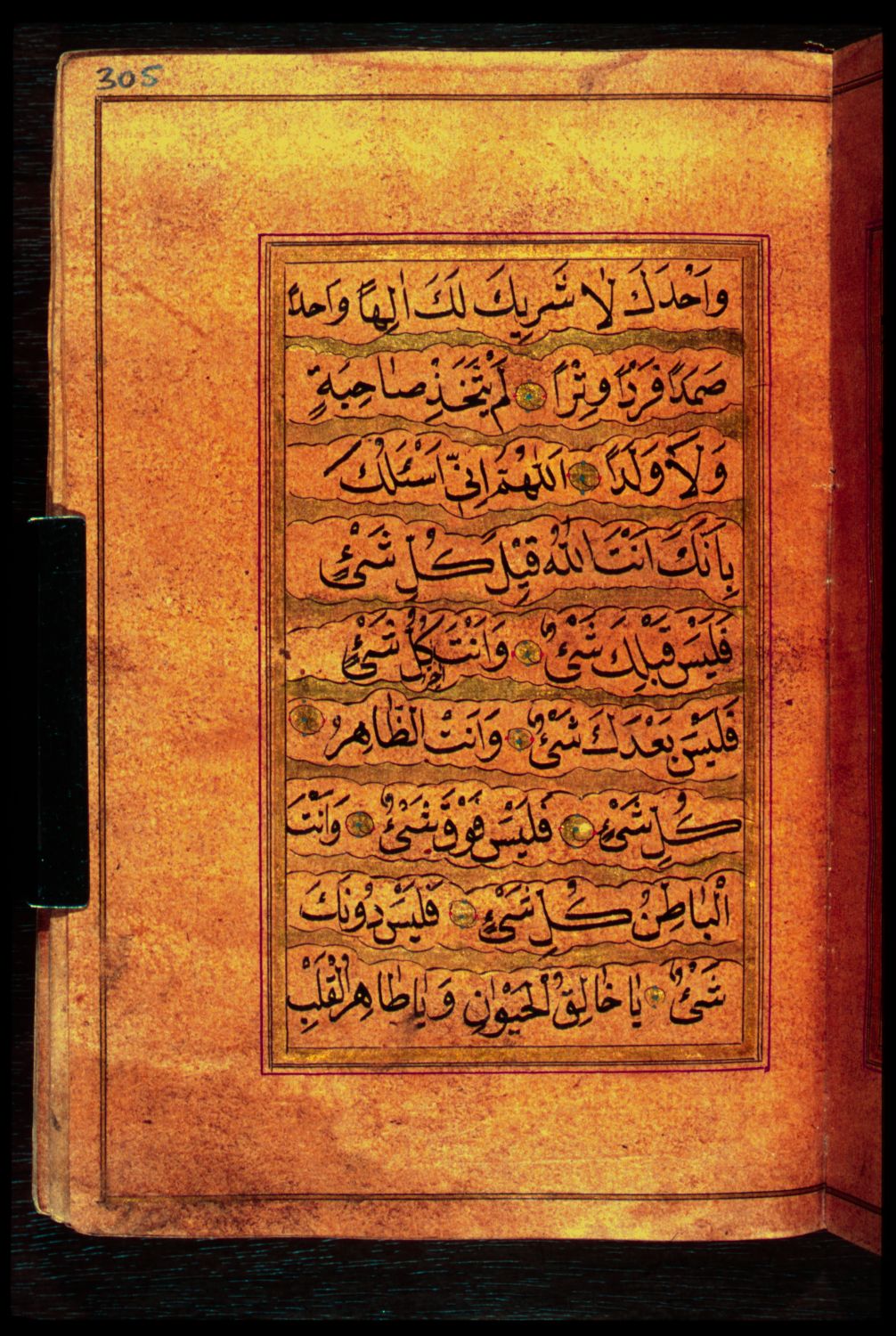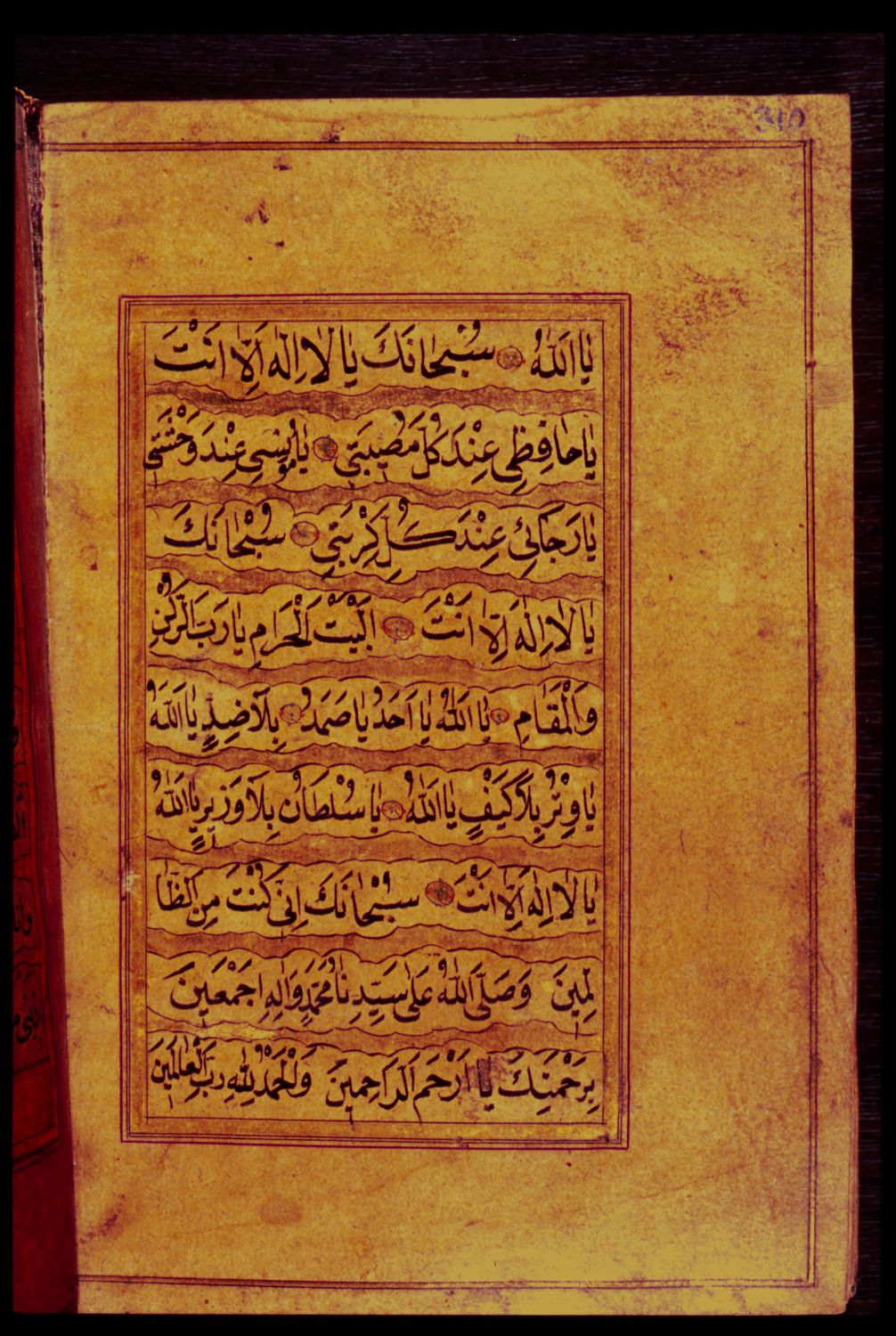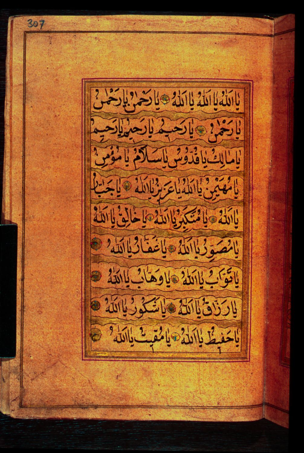 An’ām-i Sharīf, an Ottoman prayer book of the late 18th century, showing Sūrat al-Fātiḥa. Collective volume with texts in Arabic and Turkish, manuscript on brownish coloured European paper (with watermark, not further analyzed) of two different types (pp. 1-312, 313-412), written mostly in a bold, fully vocalized naskh script. Two (or possibly even three) hands can be distinguished: pp. 4-271, 272-310, 313-403, the first of which is of calligraphic quality, the others are less accomplished, and on p. 311 the colophon is written in thuluth script by the first or second copyist. The divide between the two sorts of paper coincides with the divide between hands. At the end of the volume (pp. 406-408) a Turkish text has been added, which is written in ruqʿa script within frames that were not used for the second part of the volume. The entire content of the volume is set within a composite frame (gold, red), black ink, with the use of gold and white ink, and several colours. Up till p. 311 the texts are written in 9 lines to the page (traces of the use of a misṭara), with cloud shaped divisions between the lines. From p. 313 onwards many calligraphic panels and drawings are given with a varied number of lines. The first part of the manuscript is dated 1201 (1786-1787), and was allegedly copied by Mūsā Efendi b. Ḥasan Efendi, a pupil of Ibrāhīm al-Rudūsī Efendi, but actually it was copied by Musṭạfā Ayyūb Efendīzāda (colophon on p. 311, see transcript and translation below). This first part has catchwords at the bottom of every verso page. Larger illuminations are on pp. 4 and 272, and in the text part there numerous smaller headings in white ink on a gold background. There are numerous illustrations in the second part (pp. 313-403). The volume is bound in a full-leather Islamic binding, with gilded ornamentation (borders, central medallion, corner pieces). Remnants of painted gold ornamentation on the edges (floral motifs) are still visible. Taken from "The Islamic Manuscripts in the McPherson Library, University of Victoria, Victoria B.C." by Jan Just Witkam (Professor of Paleography and Codicology of the Islamic World, Faculty of Humanities, Leiden University, Leiden, The Netherlands, 2010), Journal of Islamic Manuscripts 1 (2010), pp 101-142.
