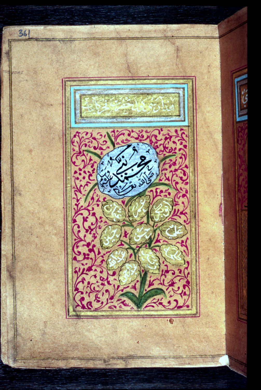 An’ām-i Sharīf, an Ottoman prayer book of the late 18th century, showing Sūrat al-Fātiḥa. Collective volume with texts in Arabic and Turkish, manuscript on brownish coloured European paper (with watermark, not further analyzed) of two different types (pp. 1-312, 313-412), written mostly in a bold, fully vocalized naskh script. Two (or possibly even three) hands can be distinguished: pp. 4-271, 272-310, 313-403, the first of which is of calligraphic quality, the others are less accomplished, and on p. 311 the colophon is written in thuluth script by the first or second copyist. The divide between the two sorts of paper coincides with the divide between hands. At the end of the volume (pp. 406-408) a Turkish text has been added, which is written in ruqʿa script within frames that were not used for the second part of the volume. The entire content of the volume is set within a composite frame (gold, red), black ink, with the use of gold and white ink, and several colours. Up till p. 311 the texts are written in 9 lines to the page (traces of the use of a misṭara), with cloud shaped divisions between the lines. From p. 313 onwards many calligraphic panels and drawings are given with a varied number of lines. The first part of the manuscript is dated 1201 (1786-1787), and was allegedly copied by Mūsā Efendi b. Ḥasan Efendi, a pupil of Ibrāhīm al-Rudūsī Efendi, but actually it was copied by Musṭạfā Ayyūb Efendīzāda (colophon on p. 311, see transcript and translation below). This first part has catchwords at the bottom of every verso page. Larger illuminations are on pp. 4 and 272, and in the text part there numerous smaller headings in white ink on a gold background. There are numerous illustrations in the second part (pp. 313-403). The volume is bound in a full-leather Islamic binding, with gilded ornamentation (borders, central medallion, corner pieces). Remnants of painted gold ornamentation on the edges (floral motifs) are still visible. Taken from "The Islamic Manuscripts in the McPherson Library, University of Victoria, Victoria B.C." by Jan Just Witkam (Professor of Paleography and Codicology of the Islamic World, Faculty of Humanities, Leiden University, Leiden, The Netherlands, 2010), Journal of Islamic Manuscripts 1 (2010), pp 101-142.
