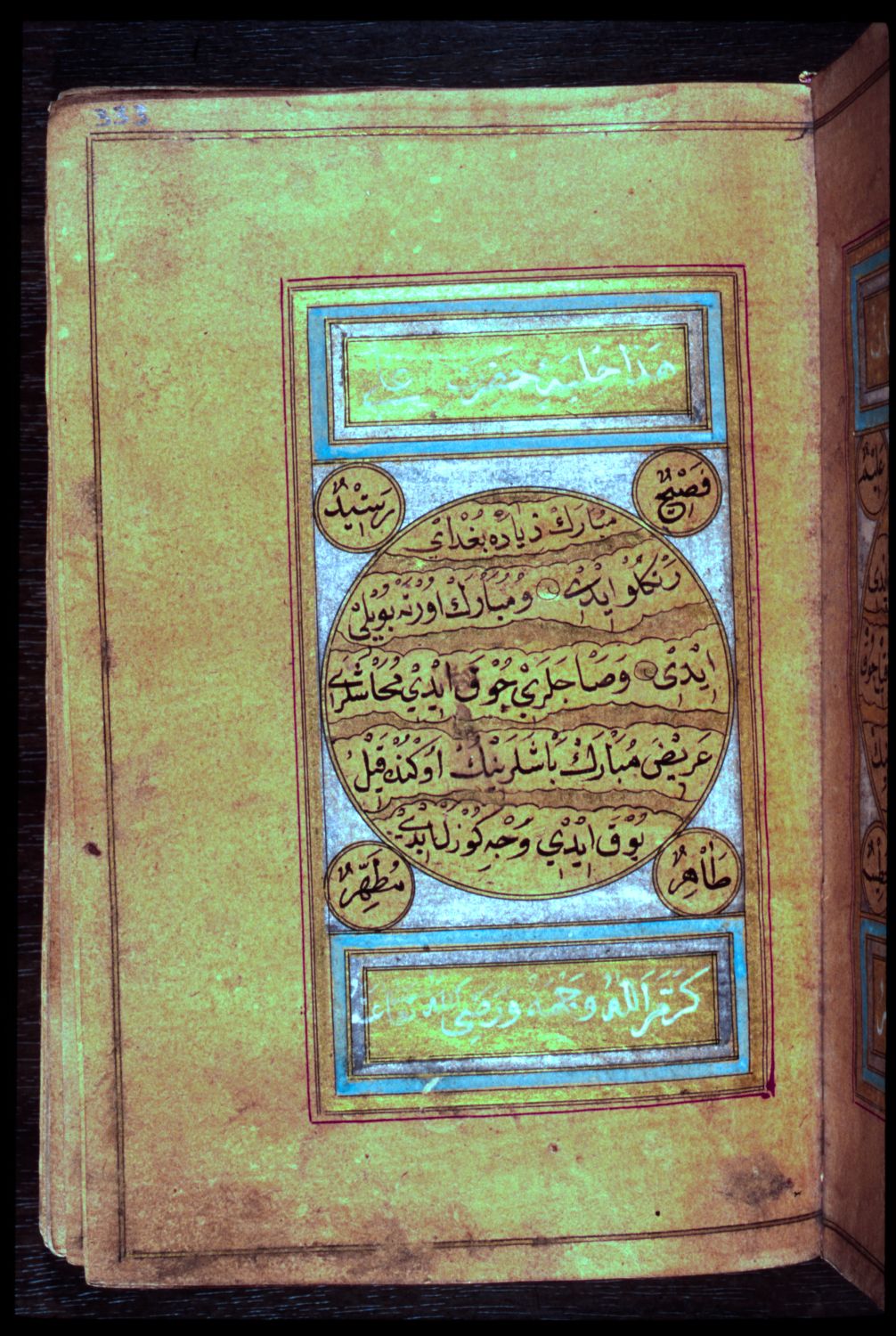 An’ām-i Sharīf, an Ottoman prayer book of the late 18th century, showing Sūrat al-Fātiḥa. Collective volume with texts in Arabic and Turkish, manuscript on brownish coloured European paper (with watermark, not further analyzed) of two different types (pp. 1-312, 313-412), written mostly in a bold, fully vocalized naskh script. Two (or possibly even three) hands can be distinguished: pp. 4-271, 272-310, 313-403, the first of which is of calligraphic quality, the others are less accomplished, and on p. 311 the colophon is written in thuluth script by the first or second copyist. The divide between the two sorts of paper coincides with the divide between hands. At the end of the volume (pp. 406-408) a Turkish text has been added, which is written in ruqʿa script within frames that were not used for the second part of the volume. The entire content of the volume is set within a composite frame (gold, red), black ink, with the use of gold and white ink, and several colours. Up till p. 311 the texts are written in 9 lines to the page (traces of the use of a misṭara), with cloud shaped divisions between the lines. From p. 313 onwards many calligraphic panels and drawings are given with a varied number of lines. The first part of the manuscript is dated 1201 (1786-1787), and was allegedly copied by Mūsā Efendi b. Ḥasan Efendi, a pupil of Ibrāhīm al-Rudūsī Efendi, but actually it was copied by Musṭạfā Ayyūb Efendīzāda (colophon on p. 311, see transcript and translation below). This first part has catchwords at the bottom of every verso page. Larger illuminations are on pp. 4 and 272, and in the text part there numerous smaller headings in white ink on a gold background. There are numerous illustrations in the second part (pp. 313-403). The volume is bound in a full-leather Islamic binding, with gilded ornamentation (borders, central medallion, corner pieces). Remnants of painted gold ornamentation on the edges (floral motifs) are still visible. Taken from "The Islamic Manuscripts in the McPherson Library, University of Victoria, Victoria B.C." by Jan Just Witkam (Professor of Paleography and Codicology of the Islamic World, Faculty of Humanities, Leiden University, Leiden, The Netherlands, 2010), Journal of Islamic Manuscripts 1 (2010), pp 101-142.
