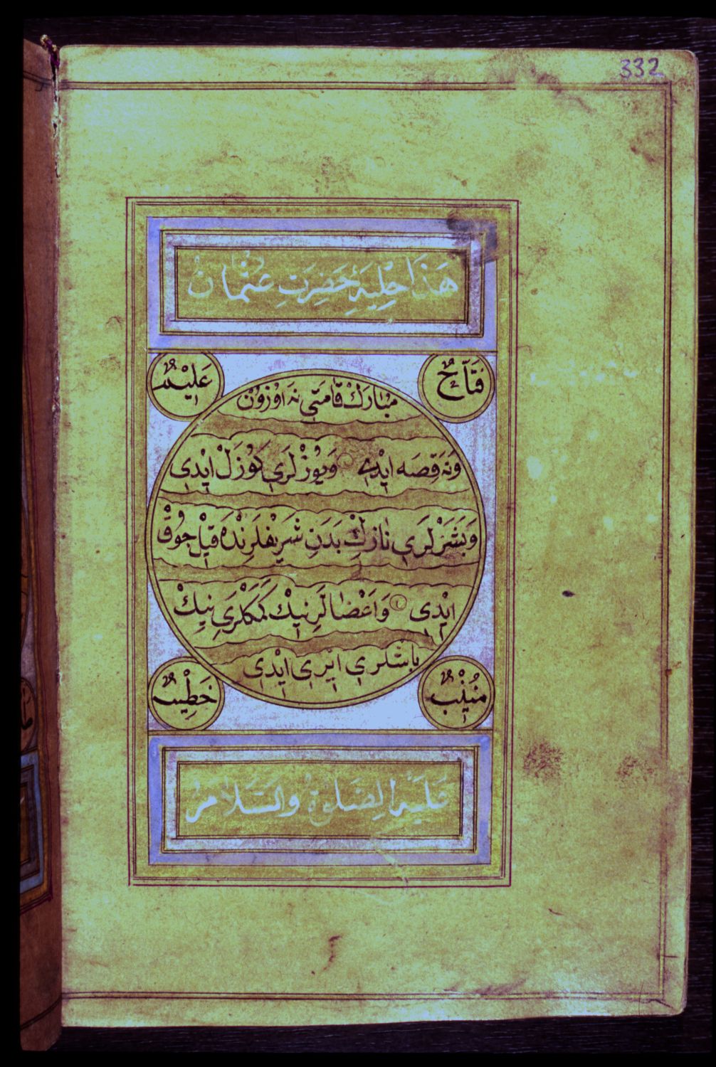 - Manuscript on brownish coloured European paper (with watermark, not further analyzed) of two different types (pp. 1-312, 313-412), written mostly in a bold, fully vocalized naskh script. The volume is bound in a full-leather Islamic binding, with gilded ornamentation (borders, central medallion, corner pieces). Remnants of painted gold ornamentation on the edges (floral motifs) are still visible. Two (or possibly even three) hands can be distinguished: pp. 4-271, 272-310, 313-403, the first of which is of calligraphic quality, the others are less accomplished, and on p. 311 the colophon is written in thuluth script by the first or second copyist. The divide between the two sorts of paper coincides with the divide between hands. At the end of the volume (pp. 406-408) a Turkish text has been added, which is written in ruqʿa script within frames that were not used for the second part of the volume. The entire content of the volume is set within a composite frame (gold, red), black ink, with the use of gold and white ink, and several colours. Up till p. 311 the texts are written in 9 lines to the page (traces of the use of a mist'ara), with cloud shaped divisions between the lines. From p. 313 onwards many calligraphic panels and drawings are given with a varied number of lines. -- Bookseller's description