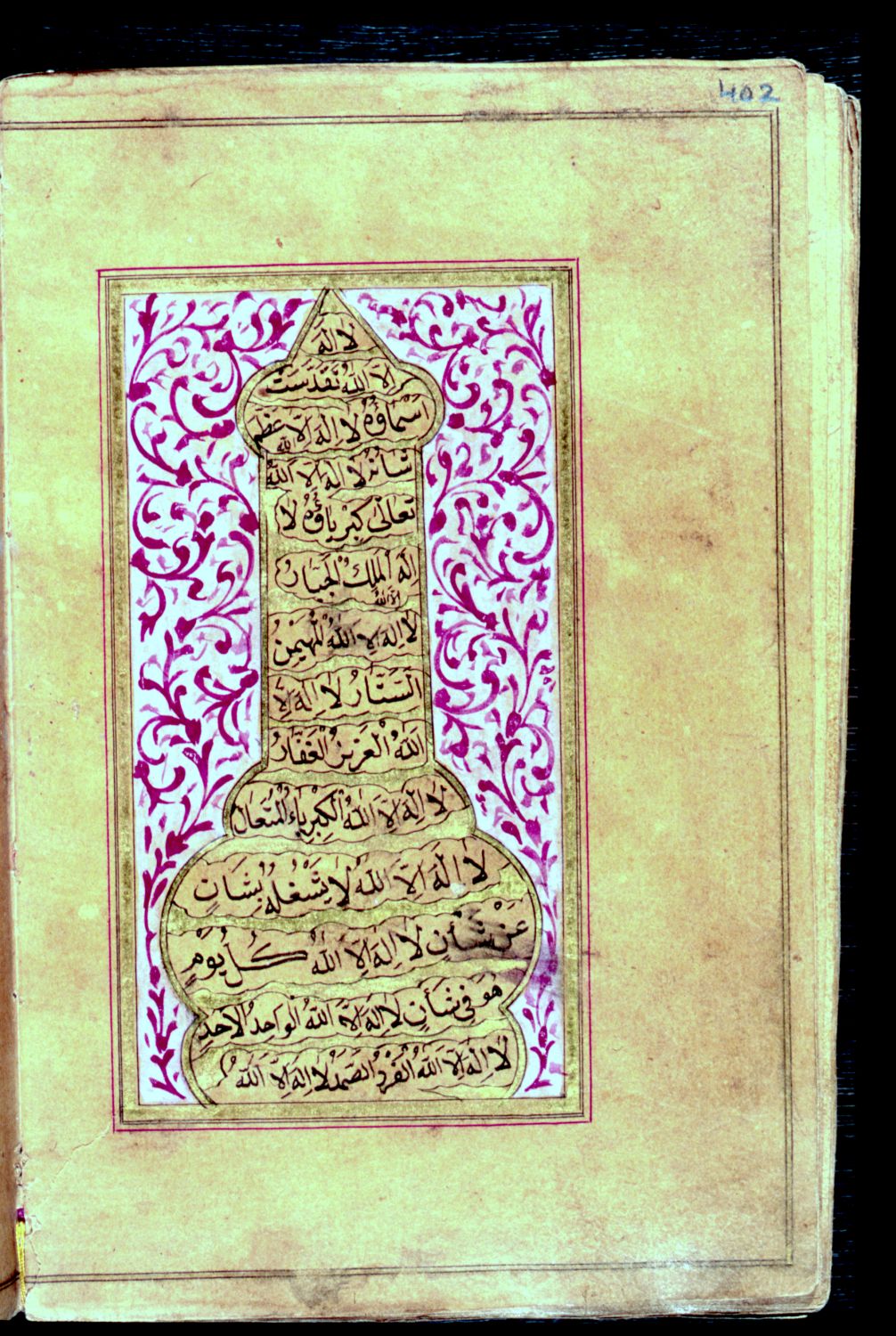 An’ām-i Sharīf, an Ottoman prayer book of the late 18th century, showing Sūrat al-Fātiḥa. Collective volume with texts in Arabic and Turkish, manuscript on brownish coloured European paper (with watermark, not further analyzed) of two different types (pp. 1-312, 313-412), written mostly in a bold, fully vocalized naskh script. Two (or possibly even three) hands can be distinguished: pp. 4-271, 272-310, 313-403, the first of which is of calligraphic quality, the others are less accomplished, and on p. 311 the colophon is written in thuluth script by the first or second copyist. The divide between the two sorts of paper coincides with the divide between hands. At the end of the volume (pp. 406-408) a Turkish text has been added, which is written in ruqʿa script within frames that were not used for the second part of the volume. The entire content of the volume is set within a composite frame (gold, red), black ink, with the use of gold and white ink, and several colours. Up till p. 311 the texts are written in 9 lines to the page (traces of the use of a misṭara), with cloud shaped divisions between the lines. From p. 313 onwards many calligraphic panels and drawings are given with a varied number of lines. The first part of the manuscript is dated 1201 (1786-1787), and was allegedly copied by Mūsā Efendi b. Ḥasan Efendi, a pupil of Ibrāhīm al-Rudūsī Efendi, but actually it was copied by Musṭạfā Ayyūb Efendīzāda (colophon on p. 311, see transcript and translation below). This first part has catchwords at the bottom of every verso page. Larger illuminations are on pp. 4 and 272, and in the text part there numerous smaller headings in white ink on a gold background. There are numerous illustrations in the second part (pp. 313-403). The volume is bound in a full-leather Islamic binding, with gilded ornamentation (borders, central medallion, corner pieces). Remnants of painted gold ornamentation on the edges (floral motifs) are still visible. Taken from "The Islamic Manuscripts in the McPherson Library, University of Victoria, Victoria B.C." by Jan Just Witkam (Professor of Paleography and Codicology of the Islamic World, Faculty of Humanities, Leiden University, Leiden, The Netherlands, 2010), Journal of Islamic Manuscripts 1 (2010), pp 101-142.