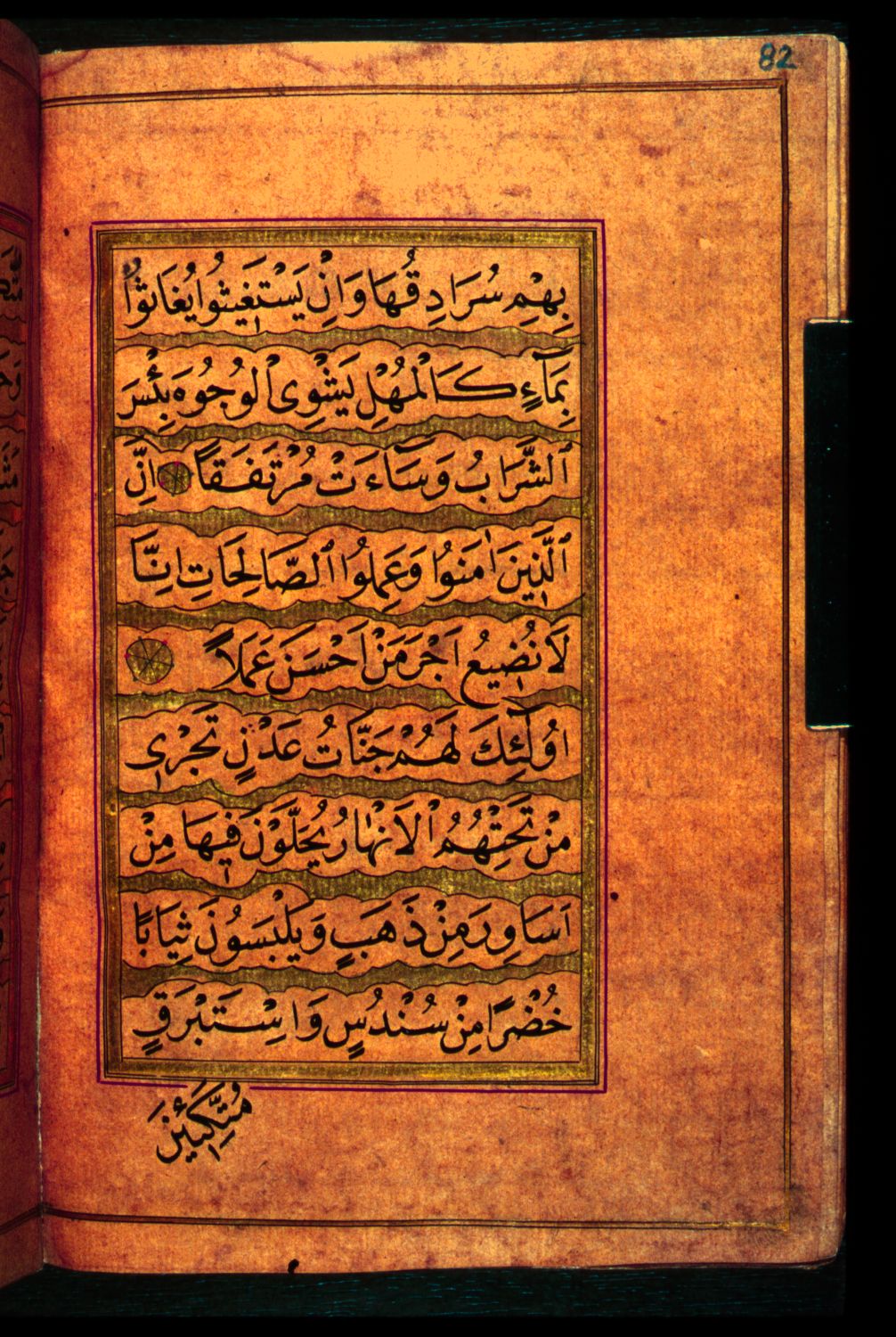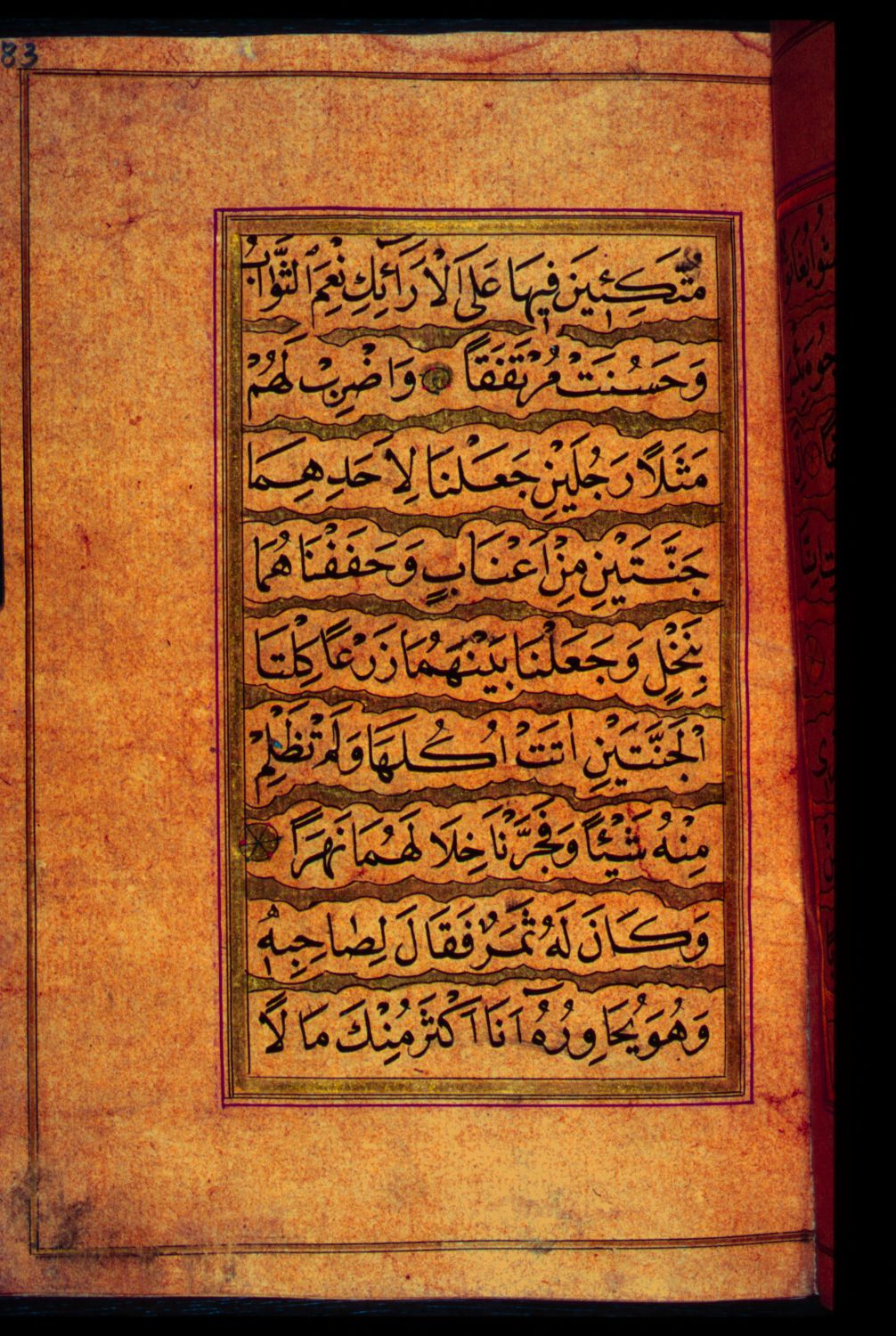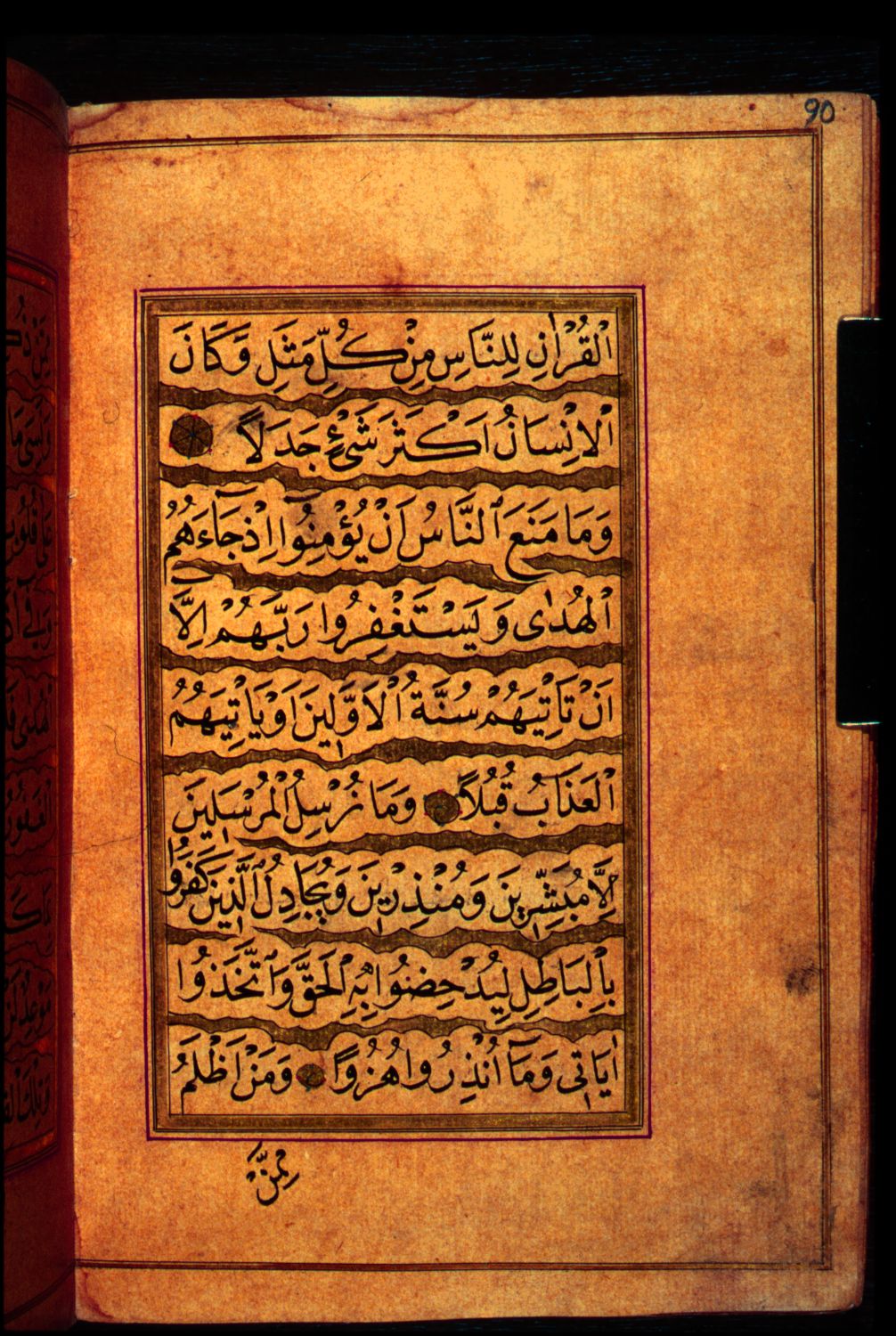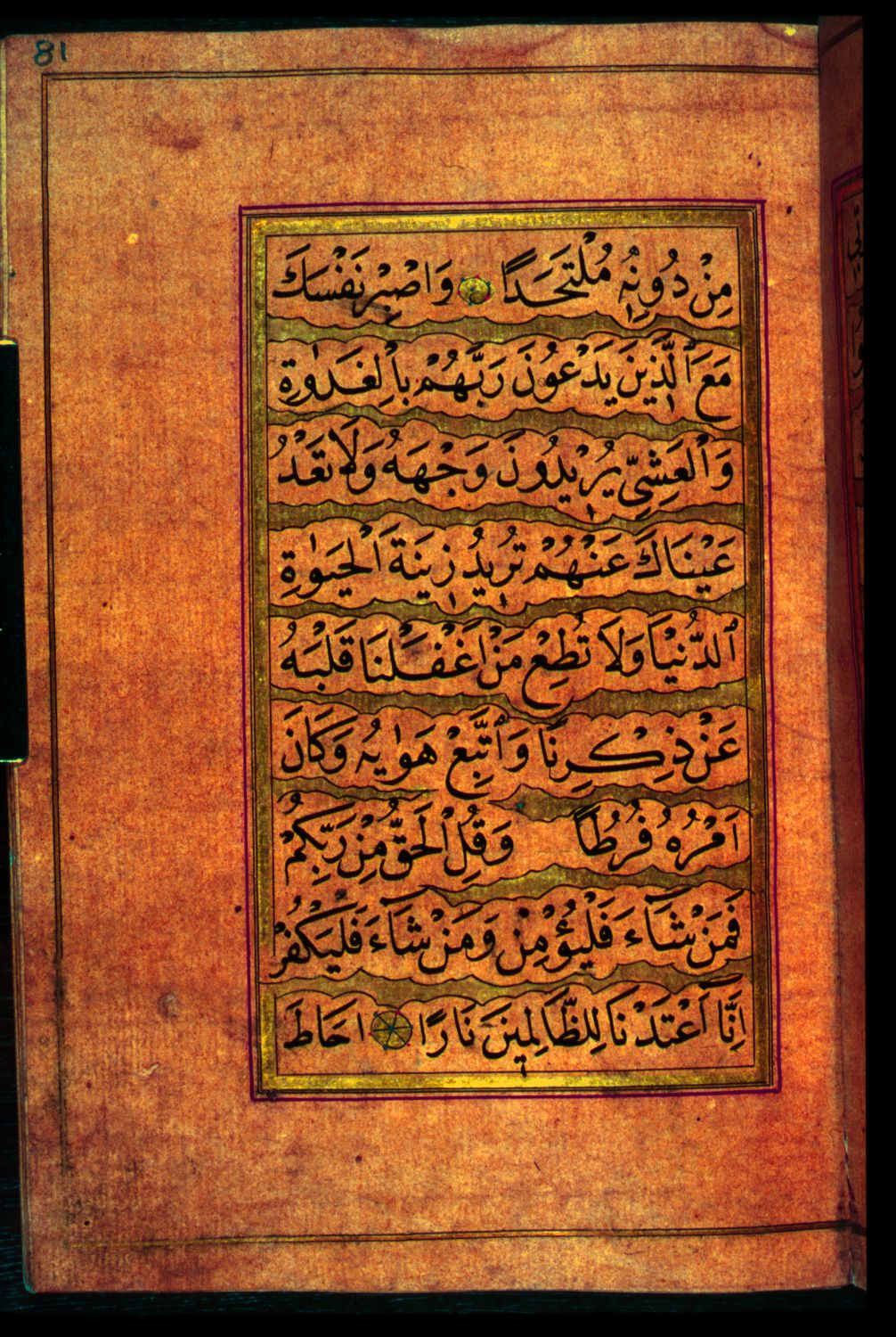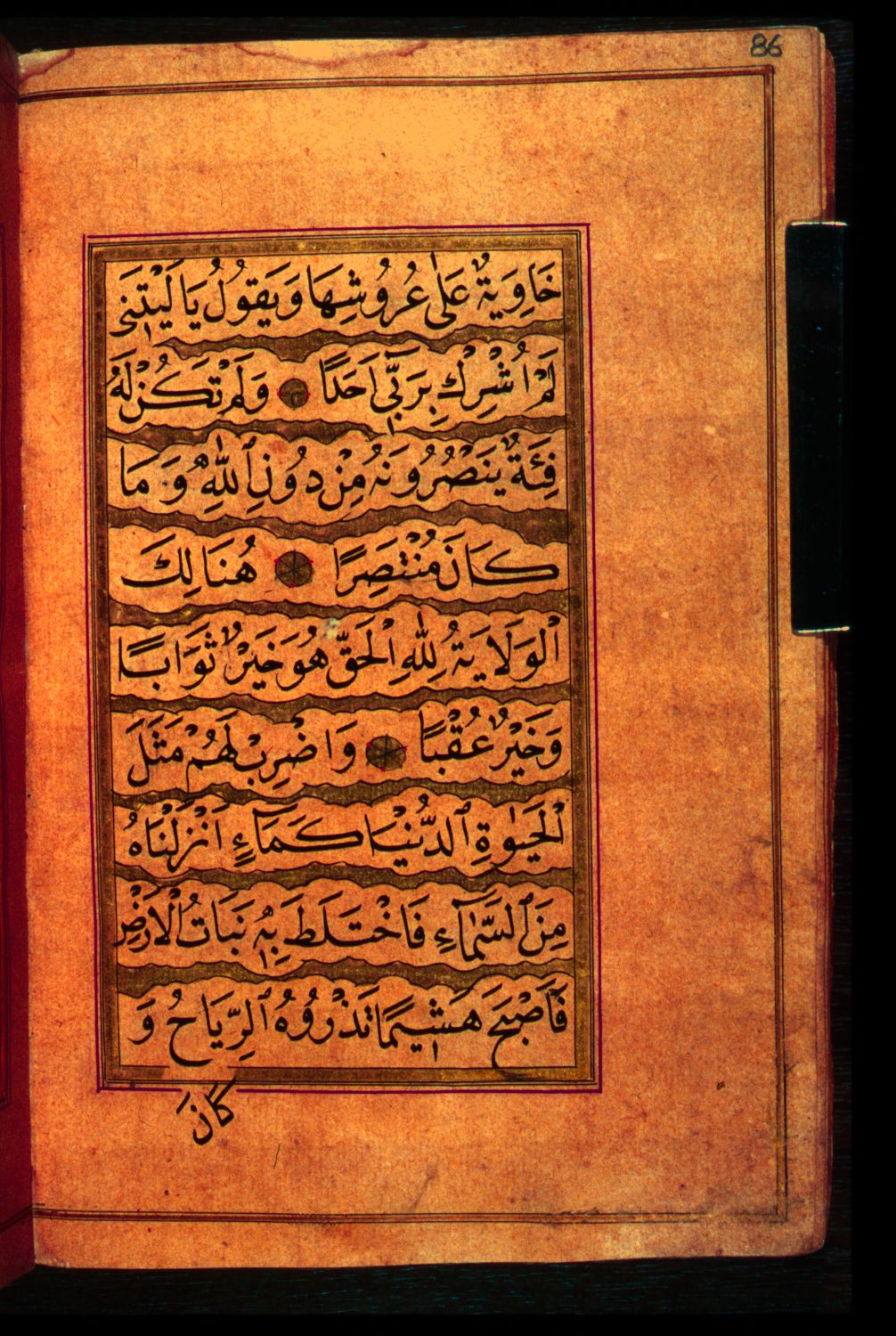 - Manuscript on brownish coloured European paper (with watermark, not further analyzed) of two different types (pp. 1-312, 313-412), written mostly in a bold, fully vocalized naskh script. The volume is bound in a full-leather Islamic binding, with gilded ornamentation (borders, central medallion, corner pieces). Remnants of painted gold ornamentation on the edges (floral motifs) are still visible. Two (or possibly even three) hands can be distinguished: pp. 4-271, 272-310, 313-403, the first of which is of calligraphic quality, the others are less accomplished, and on p. 311 the colophon is written in thuluth script by the first or second copyist. The divide between the two sorts of paper coincides with the divide between hands. At the end of the volume (pp. 406-408) a Turkish text has been added, which is written in ruqʿa script within frames that were not used for the second part of the volume. The entire content of the volume is set within a composite frame (gold, red), black ink, with the use of gold and white ink, and several colours. Up till p. 311 the texts are written in 9 lines to the page (traces of the use of a mist'ara), with cloud shaped divisions between the lines. From p. 313 onwards many calligraphic panels and drawings are given with a varied number of lines. -- Bookseller's description