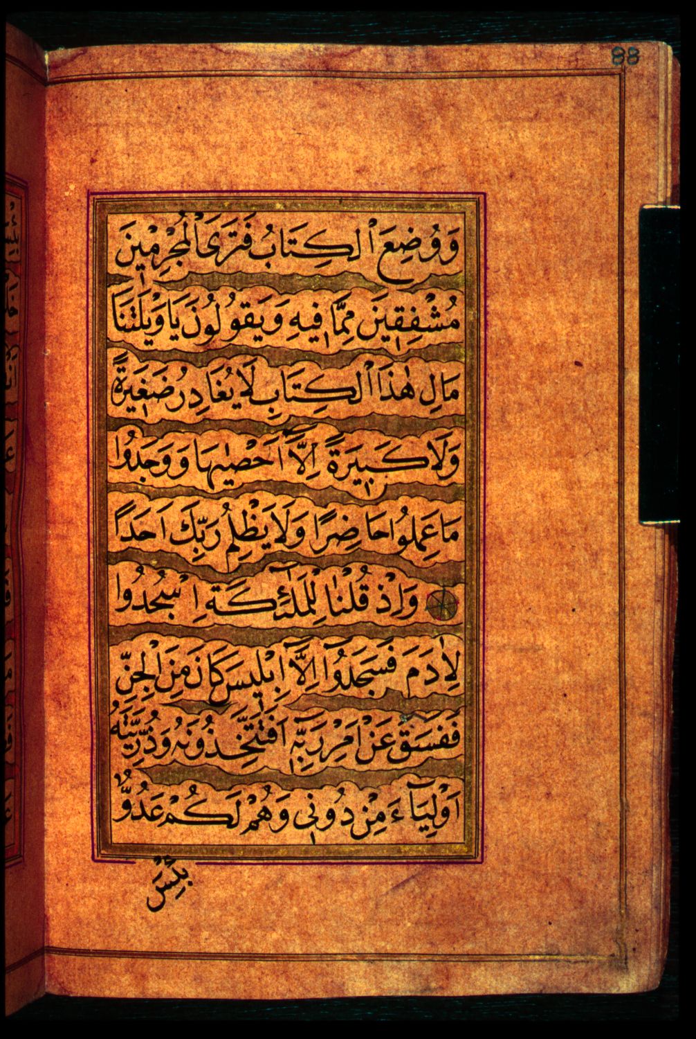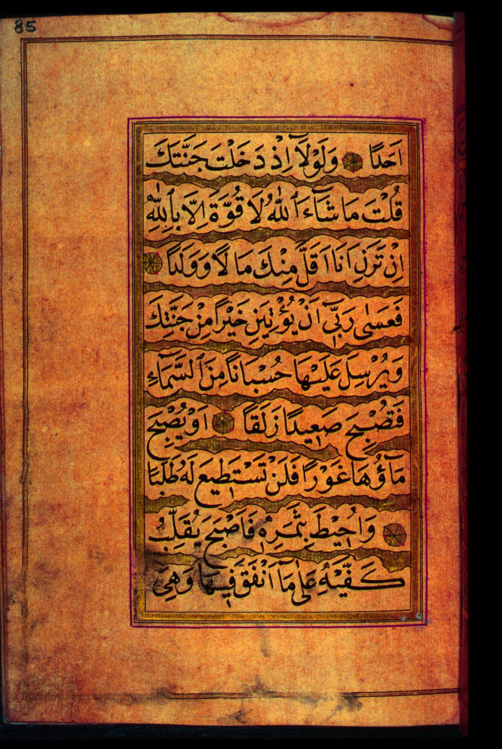 An’ām-i Sharīf, an Ottoman prayer book of the late 18th century, showing Sūrat al-Fātiḥa. Collective volume with texts in Arabic and Turkish, manuscript on brownish coloured European paper (with watermark, not further analyzed) of two different types (pp. 1-312, 313-412), written mostly in a bold, fully vocalized naskh script. Two (or possibly even three) hands can be distinguished: pp. 4-271, 272-310, 313-403, the first of which is of calligraphic quality, the others are less accomplished, and on p. 311 the colophon is written in thuluth script by the first or second copyist. The divide between the two sorts of paper coincides with the divide between hands. At the end of the volume (pp. 406-408) a Turkish text has been added, which is written in ruqʿa script within frames that were not used for the second part of the volume. The entire content of the volume is set within a composite frame (gold, red), black ink, with the use of gold and white ink, and several colours. Up till p. 311 the texts are written in 9 lines to the page (traces of the use of a misṭara), with cloud shaped divisions between the lines. From p. 313 onwards many calligraphic panels and drawings are given with a varied number of lines. The first part of the manuscript is dated 1201 (1786-1787), and was allegedly copied by Mūsā Efendi b. Ḥasan Efendi, a pupil of Ibrāhīm al-Rudūsī Efendi, but actually it was copied by Musṭạfā Ayyūb Efendīzāda (colophon on p. 311, see transcript and translation below). This first part has catchwords at the bottom of every verso page. Larger illuminations are on pp. 4 and 272, and in the text part there numerous smaller headings in white ink on a gold background. There are numerous illustrations in the second part (pp. 313-403). The volume is bound in a full-leather Islamic binding, with gilded ornamentation (borders, central medallion, corner pieces). Remnants of painted gold ornamentation on the edges (floral motifs) are still visible. Taken from "The Islamic Manuscripts in the McPherson Library, University of Victoria, Victoria B.C." by Jan Just Witkam (Professor of Paleography and Codicology of the Islamic World, Faculty of Humanities, Leiden University, Leiden, The Netherlands, 2010), Journal of Islamic Manuscripts 1 (2010), pp 101-142.