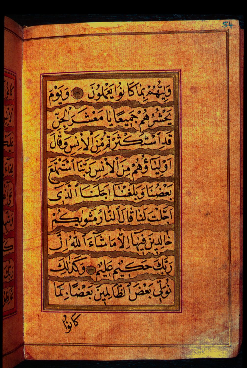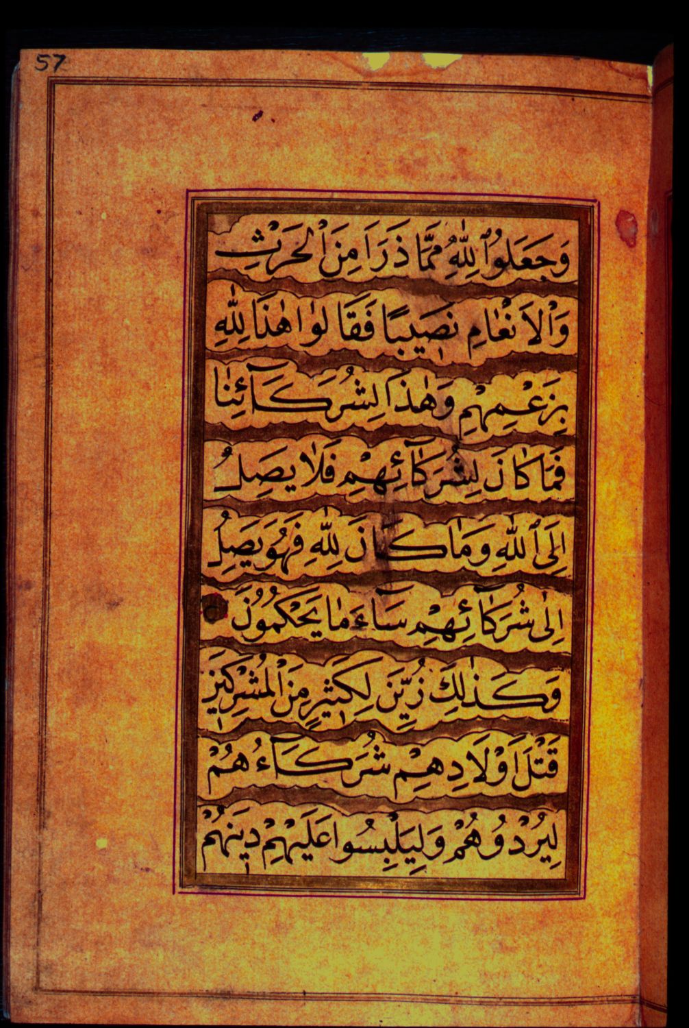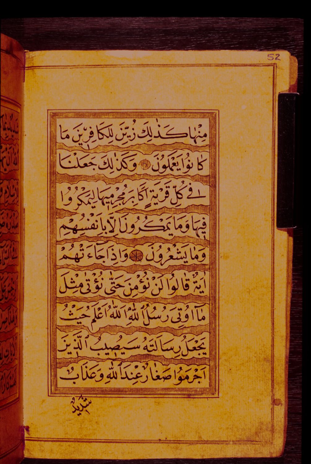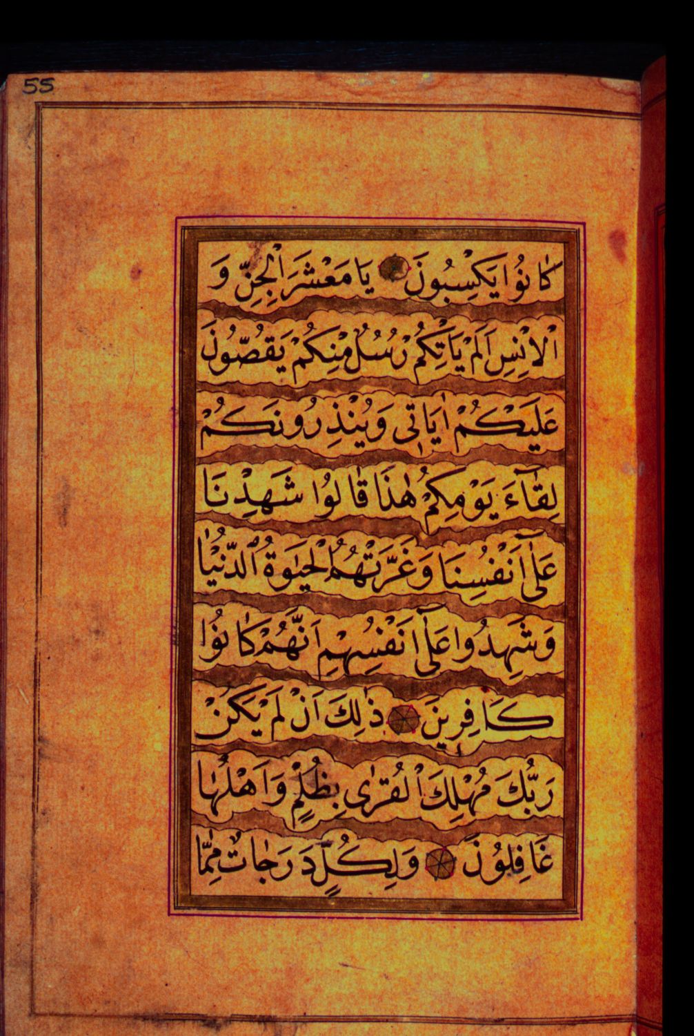 - Manuscript on brownish coloured European paper (with watermark, not further analyzed) of two different types (pp. 1-312, 313-412), written mostly in a bold, fully vocalized naskh script. The volume is bound in a full-leather Islamic binding, with gilded ornamentation (borders, central medallion, corner pieces). Remnants of painted gold ornamentation on the edges (floral motifs) are still visible. Two (or possibly even three) hands can be distinguished: pp. 4-271, 272-310, 313-403, the first of which is of calligraphic quality, the others are less accomplished, and on p. 311 the colophon is written in thuluth script by the first or second copyist. The divide between the two sorts of paper coincides with the divide between hands. At the end of the volume (pp. 406-408) a Turkish text has been added, which is written in ruqʿa script within frames that were not used for the second part of the volume. The entire content of the volume is set within a composite frame (gold, red), black ink, with the use of gold and white ink, and several colours. Up till p. 311 the texts are written in 9 lines to the page (traces of the use of a mist'ara), with cloud shaped divisions between the lines. From p. 313 onwards many calligraphic panels and drawings are given with a varied number of lines. -- Bookseller's description