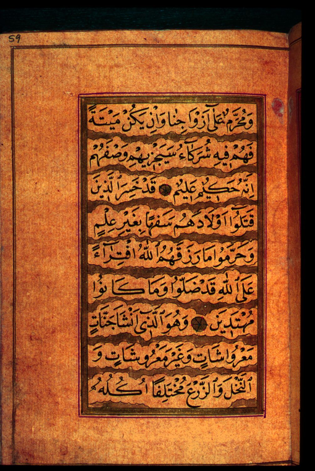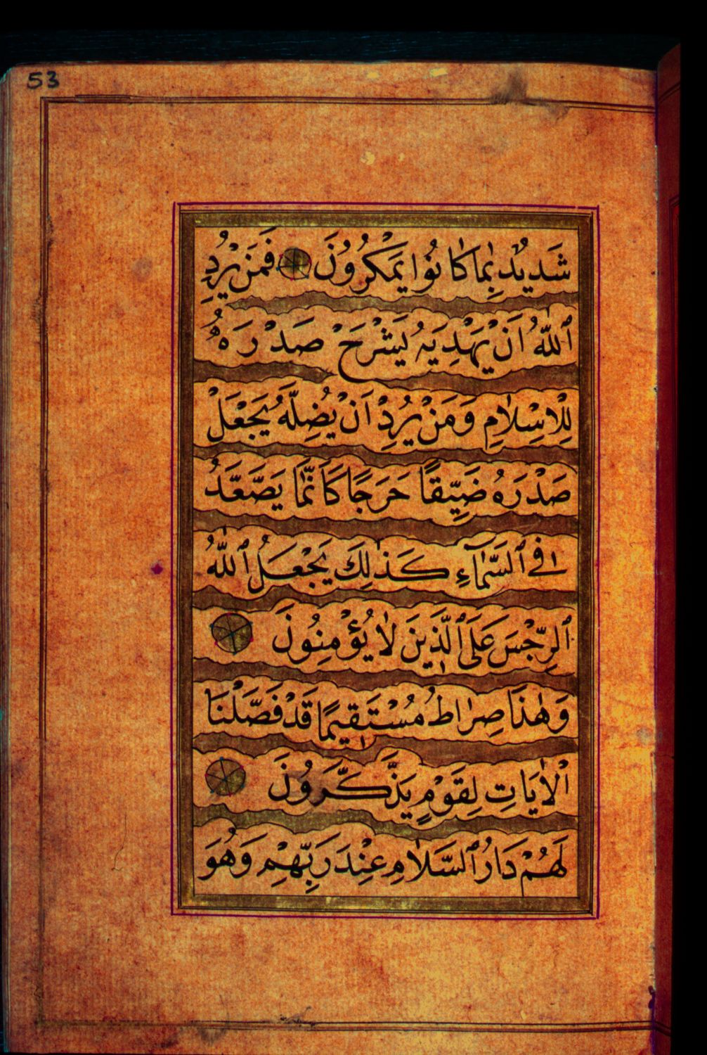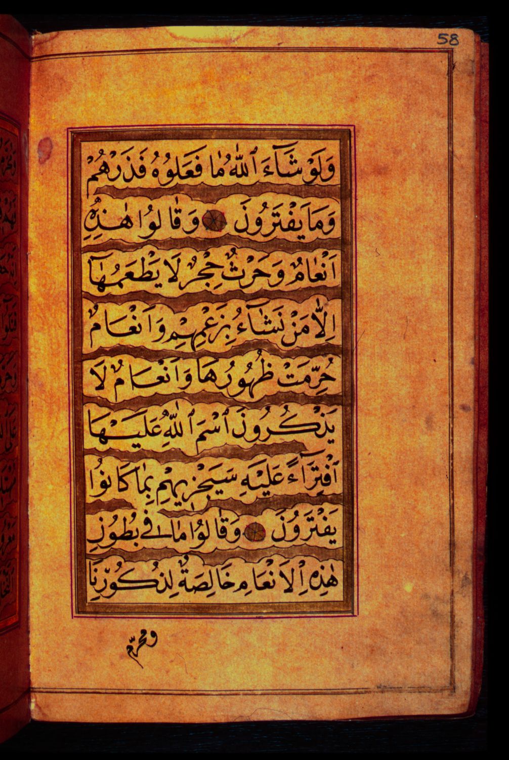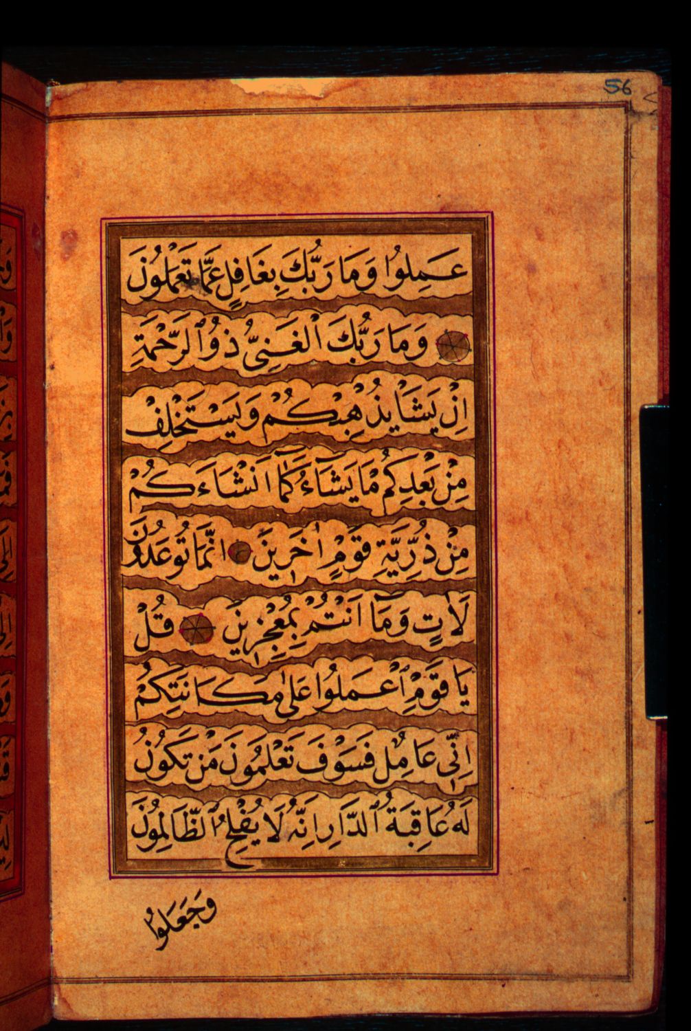 An’ām-i Sharīf, an Ottoman prayer book of the late 18th century, showing Sūrat al-Fātiḥa. Collective volume with texts in Arabic and Turkish, manuscript on brownish coloured European paper (with watermark, not further analyzed) of two different types (pp. 1-312, 313-412), written mostly in a bold, fully vocalized naskh script. Two (or possibly even three) hands can be distinguished: pp. 4-271, 272-310, 313-403, the first of which is of calligraphic quality, the others are less accomplished, and on p. 311 the colophon is written in thuluth script by the first or second copyist. The divide between the two sorts of paper coincides with the divide between hands. At the end of the volume (pp. 406-408) a Turkish text has been added, which is written in ruqʿa script within frames that were not used for the second part of the volume. The entire content of the volume is set within a composite frame (gold, red), black ink, with the use of gold and white ink, and several colours. Up till p. 311 the texts are written in 9 lines to the page (traces of the use of a misṭara), with cloud shaped divisions between the lines. From p. 313 onwards many calligraphic panels and drawings are given with a varied number of lines. The first part of the manuscript is dated 1201 (1786-1787), and was allegedly copied by Mūsā Efendi b. Ḥasan Efendi, a pupil of Ibrāhīm al-Rudūsī Efendi, but actually it was copied by Musṭạfā Ayyūb Efendīzāda (colophon on p. 311, see transcript and translation below). This first part has catchwords at the bottom of every verso page. Larger illuminations are on pp. 4 and 272, and in the text part there numerous smaller headings in white ink on a gold background. There are numerous illustrations in the second part (pp. 313-403). The volume is bound in a full-leather Islamic binding, with gilded ornamentation (borders, central medallion, corner pieces). Remnants of painted gold ornamentation on the edges (floral motifs) are still visible. Taken from "The Islamic Manuscripts in the McPherson Library, University of Victoria, Victoria B.C." by Jan Just Witkam (Professor of Paleography and Codicology of the Islamic World, Faculty of Humanities, Leiden University, Leiden, The Netherlands, 2010), Journal of Islamic Manuscripts 1 (2010), pp 101-142.