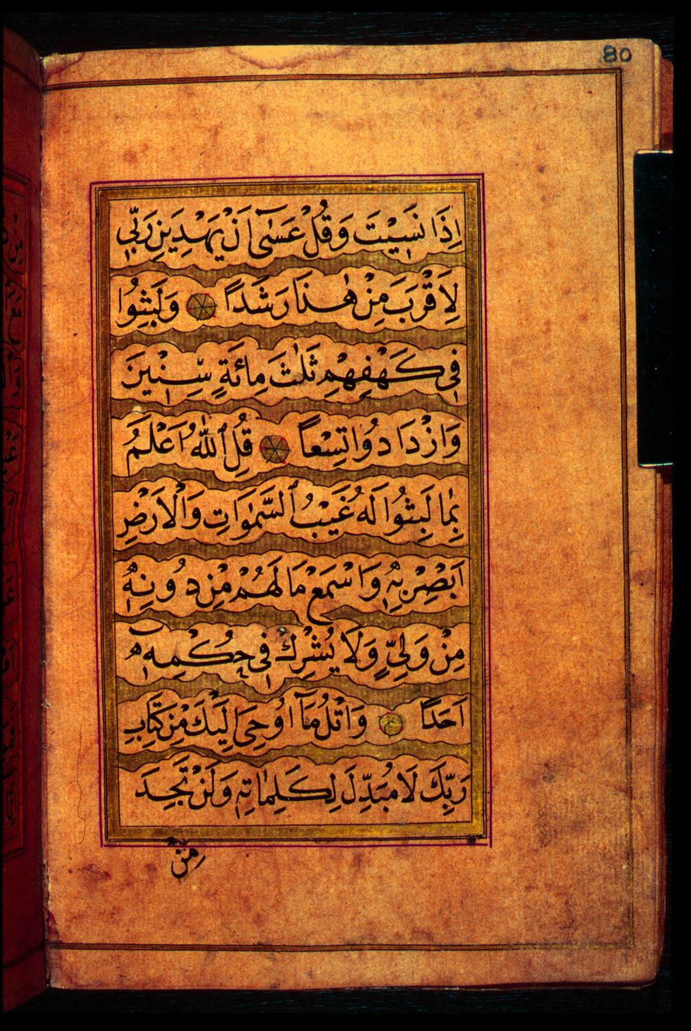 An’ām-i Sharīf, an Ottoman prayer book of the late 18th century, showing Sūrat al-Fātiḥa. Collective volume with texts in Arabic and Turkish, manuscript on brownish coloured European paper (with watermark, not further analyzed) of two different types (pp. 1-312, 313-412), written mostly in a bold, fully vocalized naskh script. Two (or possibly even three) hands can be distinguished: pp. 4-271, 272-310, 313-403, the first of which is of calligraphic quality, the others are less accomplished, and on p. 311 the colophon is written in thuluth script by the first or second copyist. The divide between the two sorts of paper coincides with the divide between hands. At the end of the volume (pp. 406-408) a Turkish text has been added, which is written in ruqʿa script within frames that were not used for the second part of the volume. The entire content of the volume is set within a composite frame (gold, red), black ink, with the use of gold and white ink, and several colours. Up till p. 311 the texts are written in 9 lines to the page (traces of the use of a misṭara), with cloud shaped divisions between the lines. From p. 313 onwards many calligraphic panels and drawings are given with a varied number of lines. The first part of the manuscript is dated 1201 (1786-1787), and was allegedly copied by Mūsā Efendi b. Ḥasan Efendi, a pupil of Ibrāhīm al-Rudūsī Efendi, but actually it was copied by Musṭạfā Ayyūb Efendīzāda (colophon on p. 311, see transcript and translation below). This first part has catchwords at the bottom of every verso page. Larger illuminations are on pp. 4 and 272, and in the text part there numerous smaller headings in white ink on a gold background. There are numerous illustrations in the second part (pp. 313-403). The volume is bound in a full-leather Islamic binding, with gilded ornamentation (borders, central medallion, corner pieces). Remnants of painted gold ornamentation on the edges (floral motifs) are still visible. Taken from "The Islamic Manuscripts in the McPherson Library, University of Victoria, Victoria B.C." by Jan Just Witkam (Professor of Paleography and Codicology of the Islamic World, Faculty of Humanities, Leiden University, Leiden, The Netherlands, 2010), Journal of Islamic Manuscripts 1 (2010), pp 101-142.