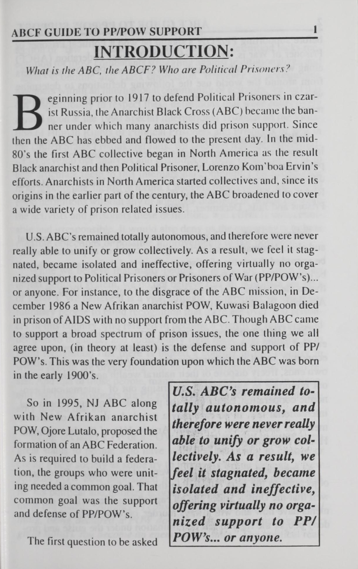 Contains information about the Anarchist Black Cross Federation (ABCF) and its history along with information about Prisoners of War (POW) and Political Prisoners (PP) and how to support them.