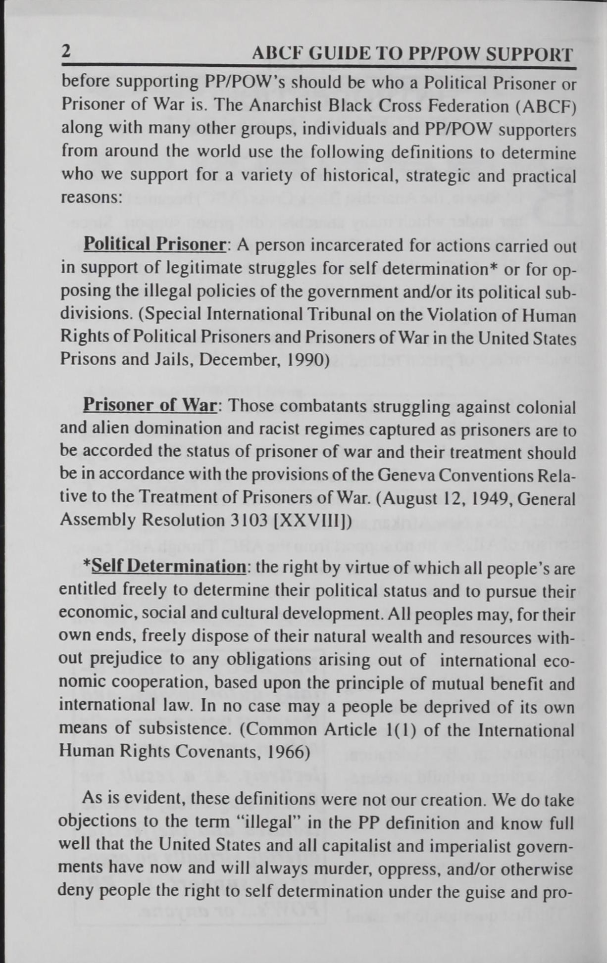 Contains information about the Anarchist Black Cross Federation (ABCF) and its history along with information about Prisoners of War (POW) and Political Prisoners (PP) and how to support them.