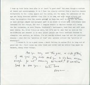 Part of a collection of correspondence to Robin Skelton from British critic and poet Kathleen Raine. In several of the letters Raine discusses the Temenos magazine, of which she was a founder. In this letter to Robin and Sylvia Skelton, Raine discusses setting up the Temenos Academy of Integral Studies, and financial difficulties. She also talks about her upcoming book "India Seen Afar" and the world climate it is being released into.