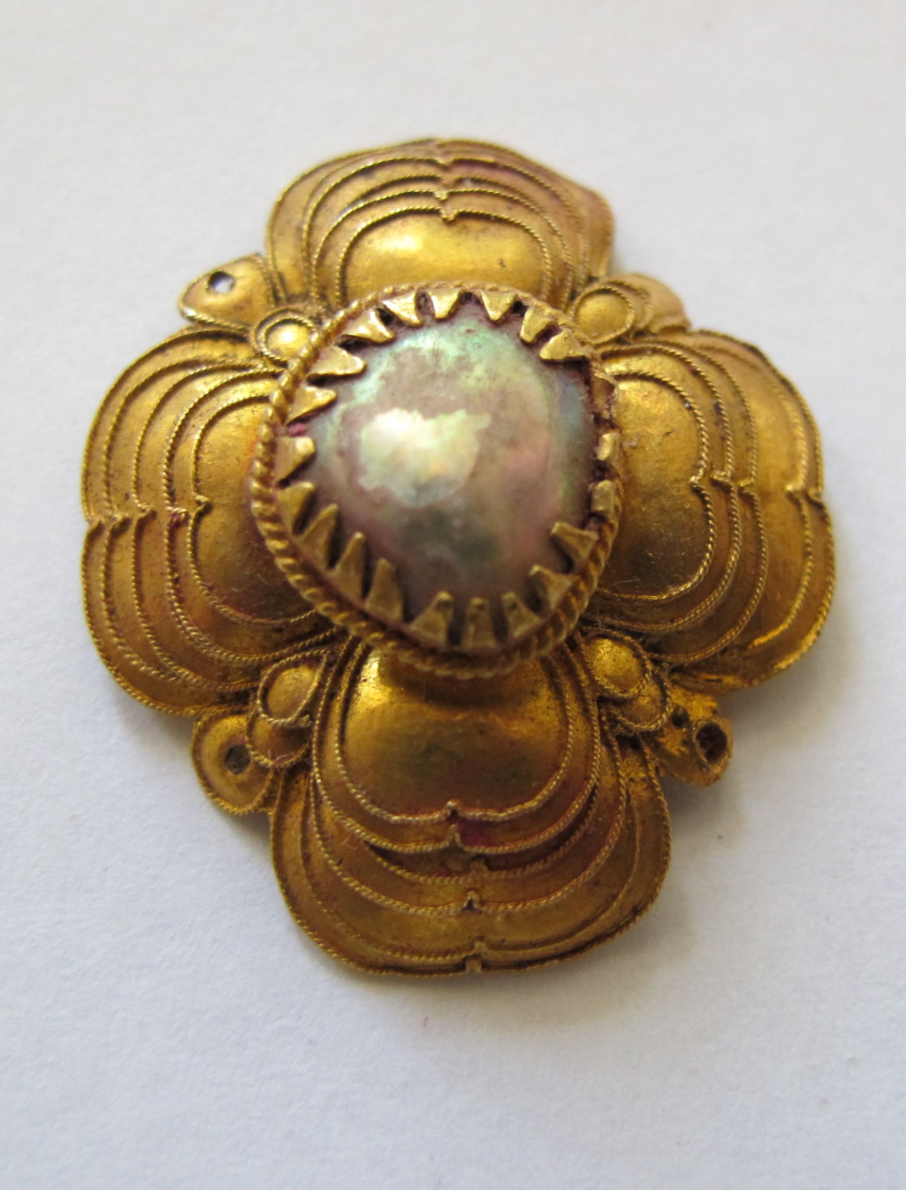 A photograph of a pearl brooch. It was one of the items placed in the time capsule of the association's new headquarters at 1715 Government Street in 1905, and discovered by the owner of the building during recent renovations.