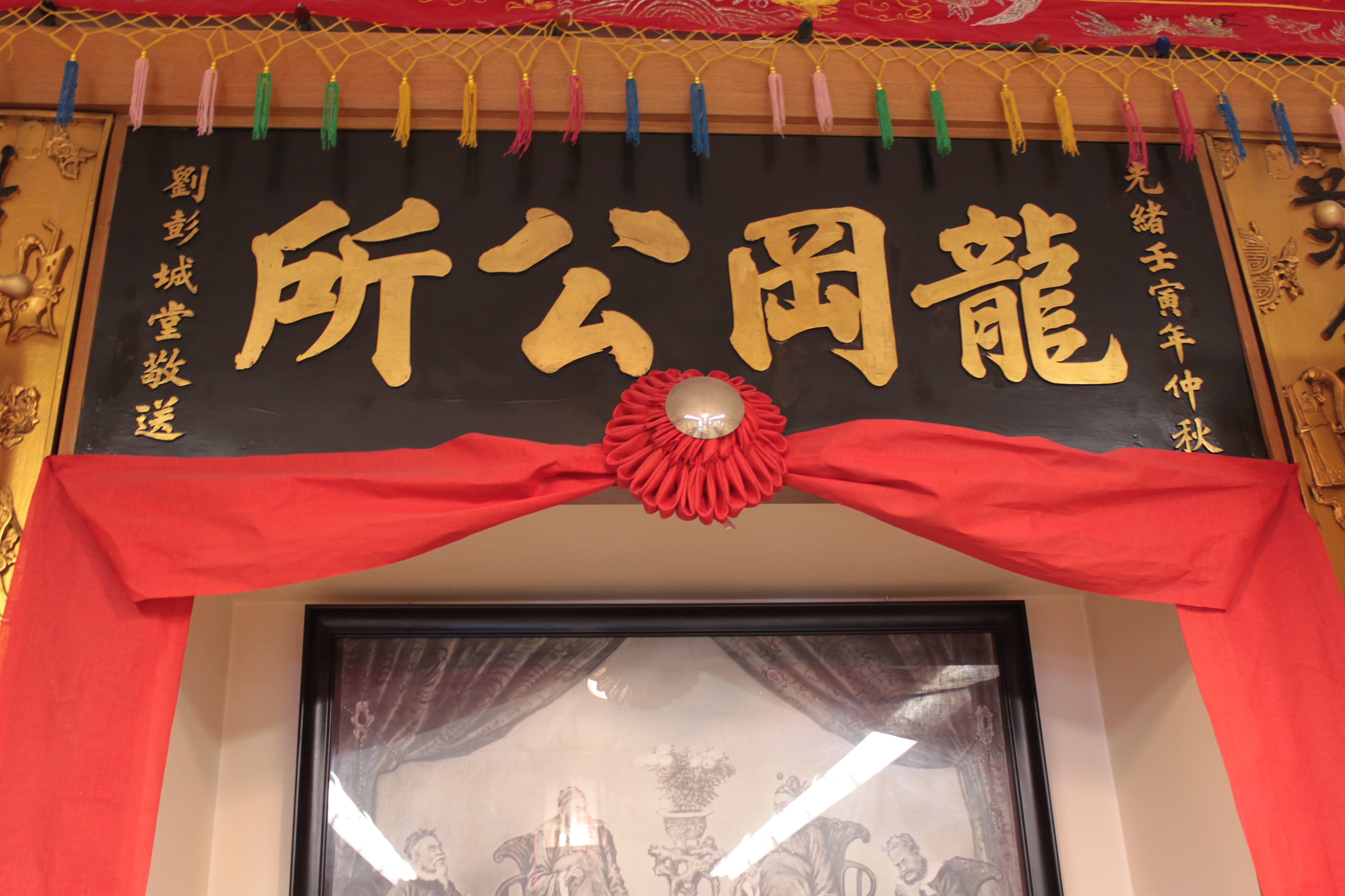 Signboard for the Lung Kong Association placed above the altar in the meeting hall of the Lung Kong Association (1717 1/2 Government Street, Victoria, B.C.). Given to the association by Liu Pengcheng Tang in Guangxu Renyin year (1902). Photo taken for Lung Kong Association picture collection. Taken on July 23, 2011.