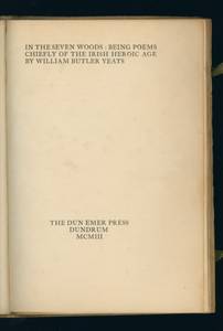 A collection of poetry by W. B. Yeats published in 1903 by Elizabeth Yeats's Dun Emer Press, the first edited by this publishing house. On title page, "Dundrum" follows "The Dun Emer Press". "Here ends In the seven woods, written by William Butler Yeats, printed, upon paper made in Ireland, and published by Elizabeth Corbet Yeats at the Dun Emer Press, in the house of Evelyn Gleeson at Dundrum in the county of Dublin, Ireland, finished the sixteenth day of July, in the year of the big wind 1903"--Colophon. This volume represents the first book of Yeats' "middle period" in which he eschewed his previous Romantic ideals and preference for pre-Raphaelite imagery, in favor of a more spare style and an anti-romantic poetic stance . Includes the poems "The Folly of Being Comforted" and "Adam's Curse" and the play "On Baile's Strand: A Play".