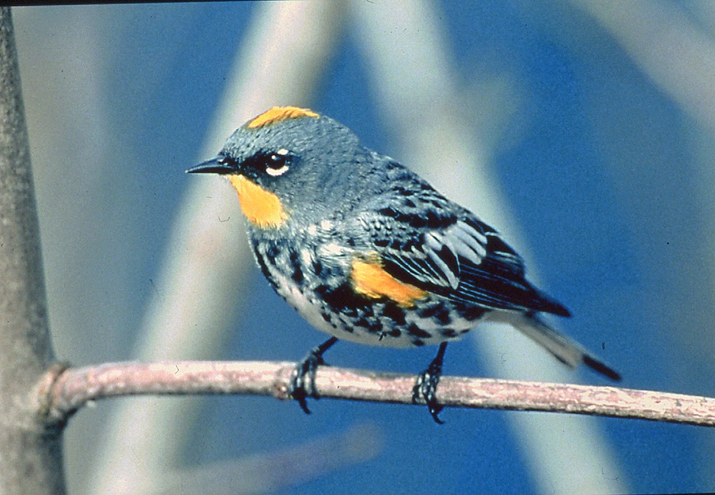 Close-up of a wood warbler perched on a branch. Likely an Audobon's warbler who are a type of wood warbler and sometimes grouped together with Myrtle's warblers to be called Yellow-rumped warblers. Photo likely taken between January and July due to yellow markings being present.