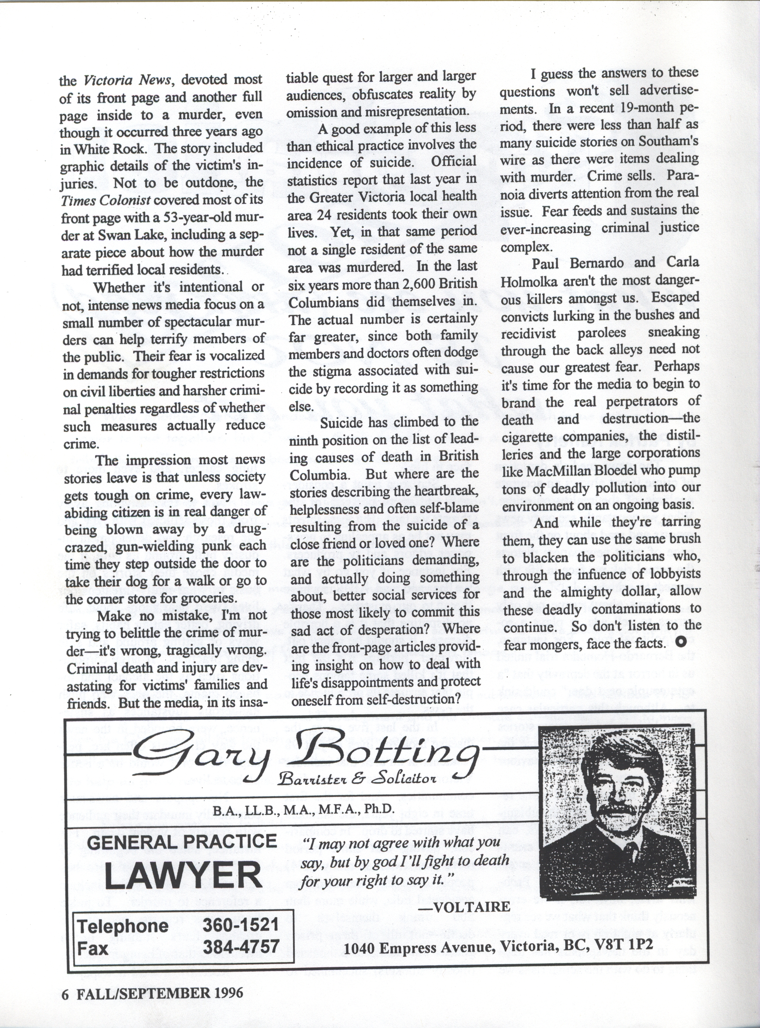 A non-profit quarterly publication of the thoughts, feelings, and distinct perspectives of prisoners and visitors by the prisoners at William Head Institution in Victoria, B.C. with the aim of providing a different view to the general public. Edited by Patrick W. Rafferty.