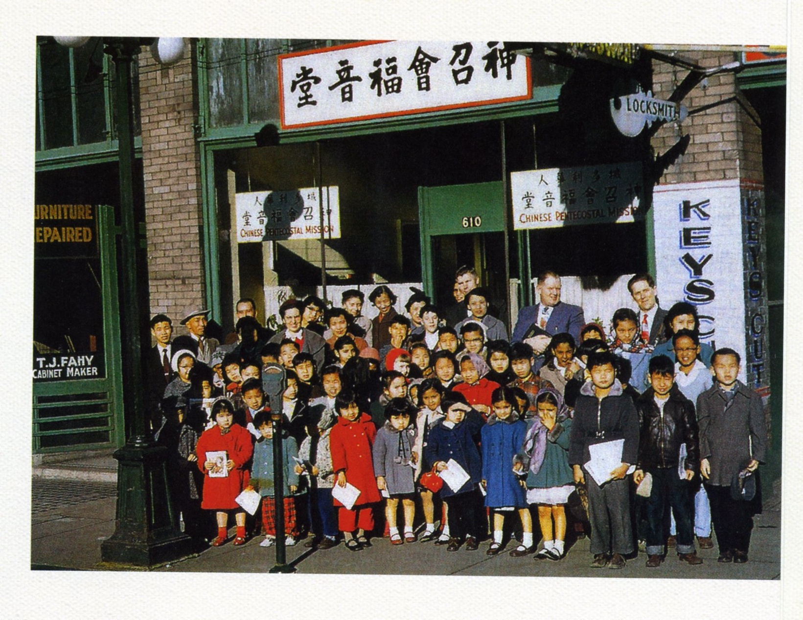 Shows Sunday school members and teachers of Chinese Pentecostal Church standing in front of the storefront church on Cormorant Street in the mid-1950s.