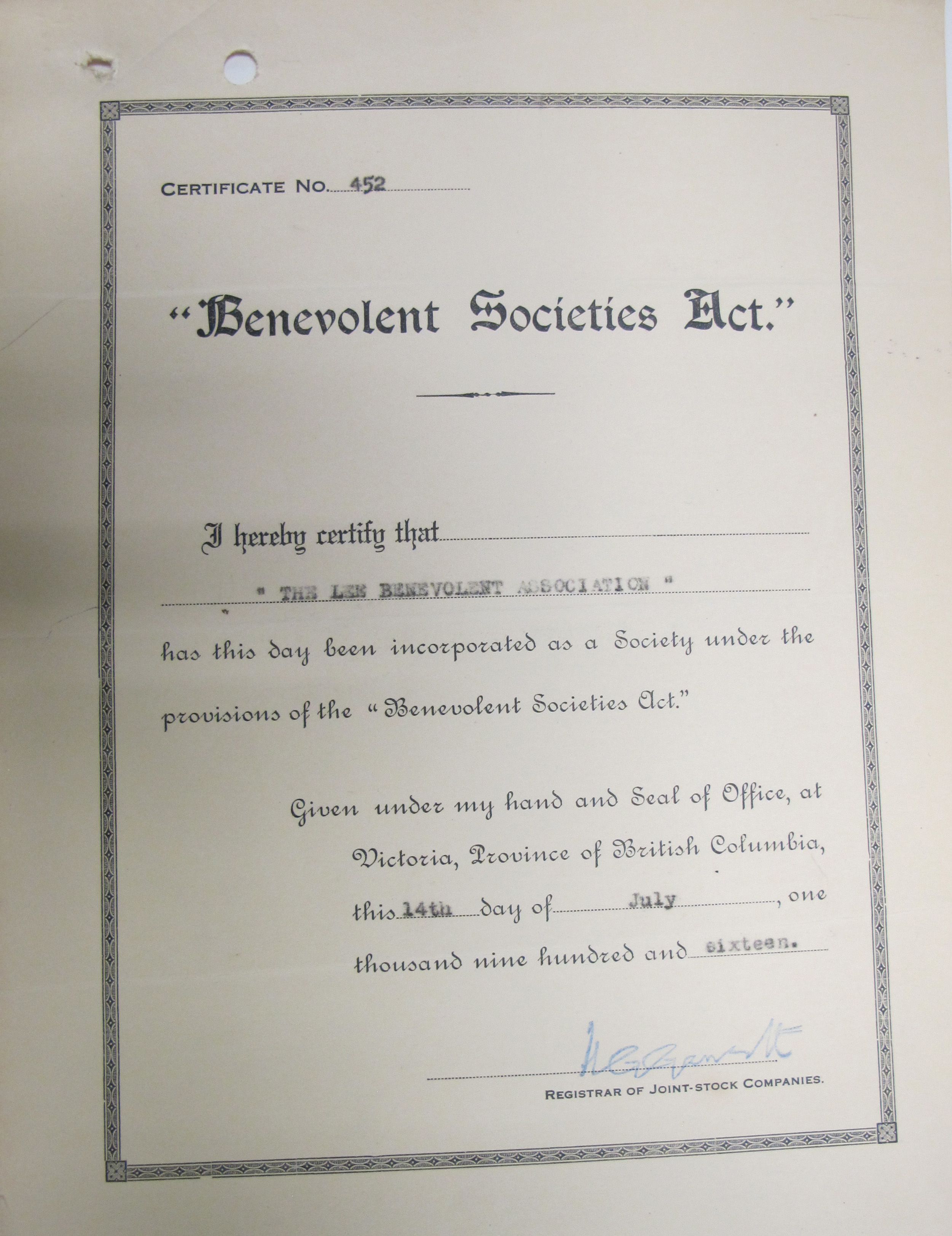 This document confirms that "The Lee Benevolent Association" was incorporated as a society in Victoria on 14 July 1916. This clan or family association traces its roots to Lao-tse, the founder of Tao-ism. Lees had arrived in British Columbia since the 1850s and had organized as a clan association in Victoria since the 1880s. The Lee's Benevolent Association built their headquarters at 614 Fisgard Street in 1911. Identifier: Society files No. S452.